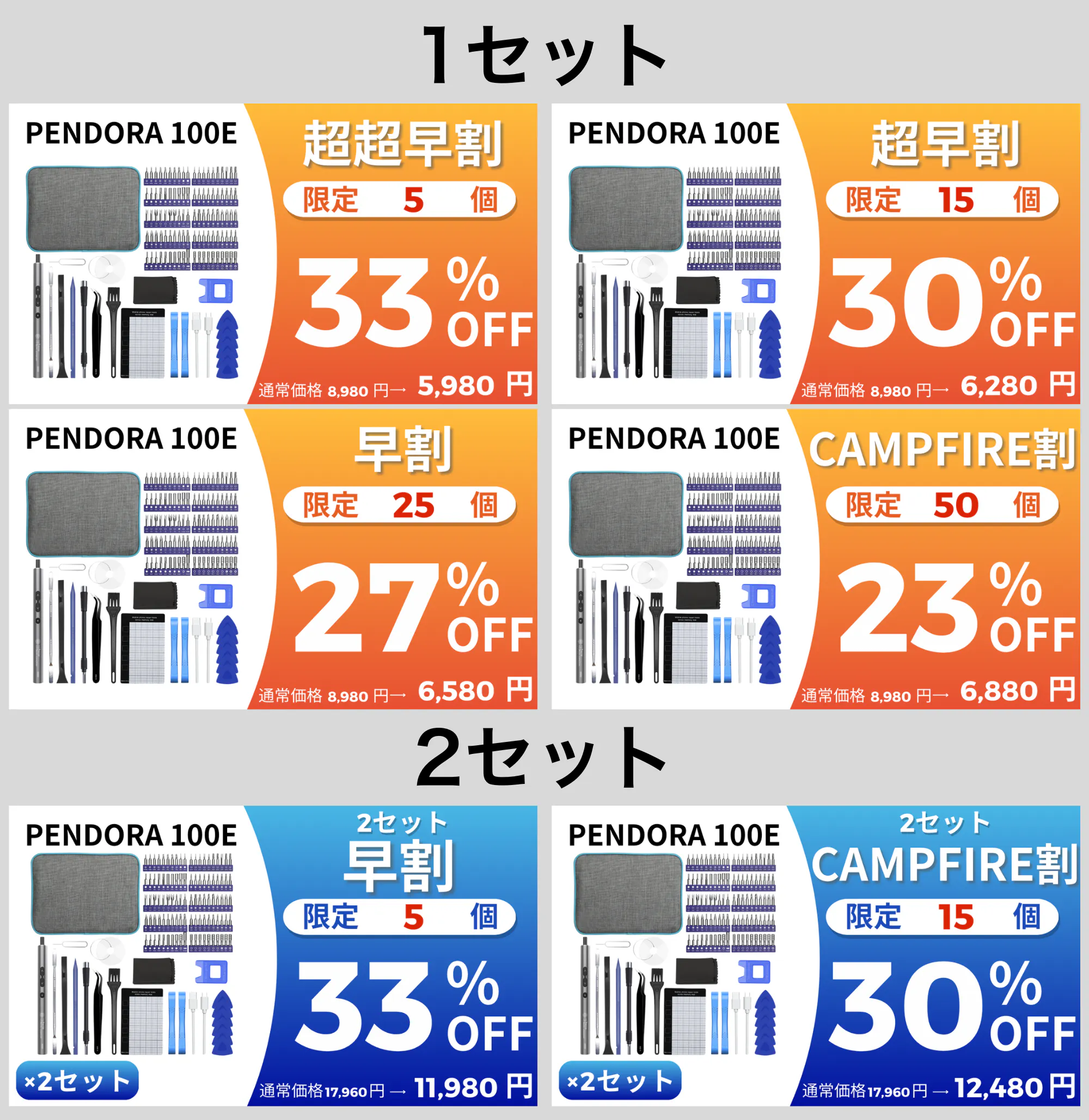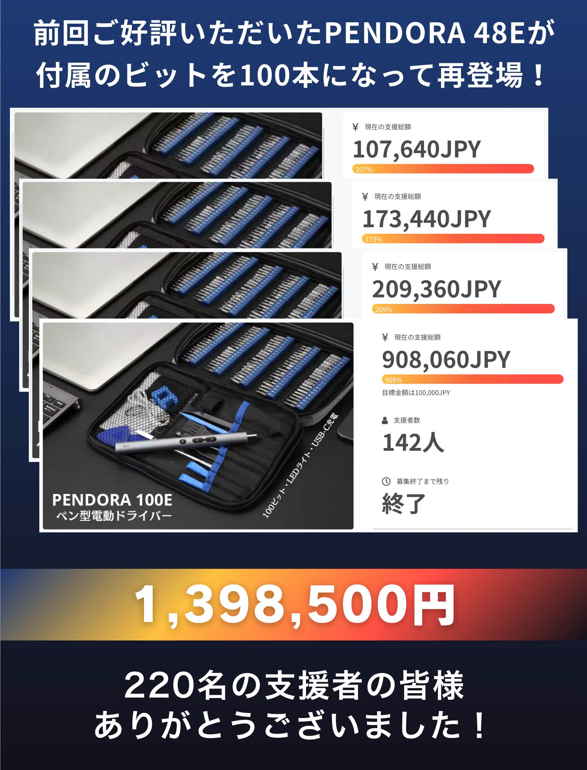 過去海外大手クラウドファンディングサイト海外クラウドファンディングで745名から、国内大手クラウドファンディングサイトでもPENDORA 48E/mini累計で約2000名よりご支援頂いております 電動ドライバーセット"PENDORA 48E"が、付属のビットを100本に増量し進化を遂げて帰ってきました!