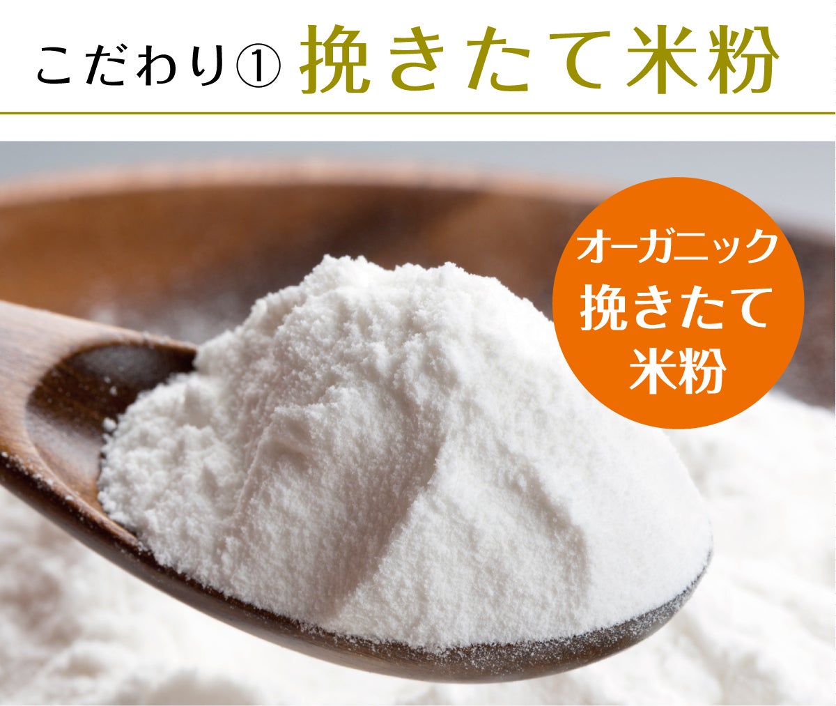 有機JAS認証を受けた有機栽培米のみを数種類、独自ブレンドして使用。食味値も高く安心して食べられる選りすぐりのお米を販売日当日の朝一番で挽いています。挽きたてのオーガニック米粉の豊かな風味を詰め込んでいます。