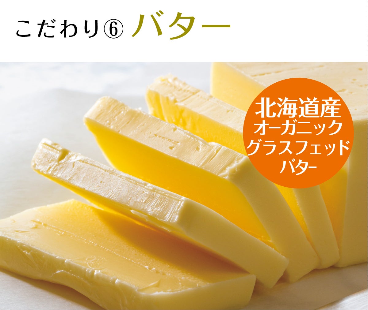 有機JAS認証を受け、健康な牧草のみで育てた栄養価の高い希少な北海道産オーガニックグラスフェッドバターのみを使用しています。