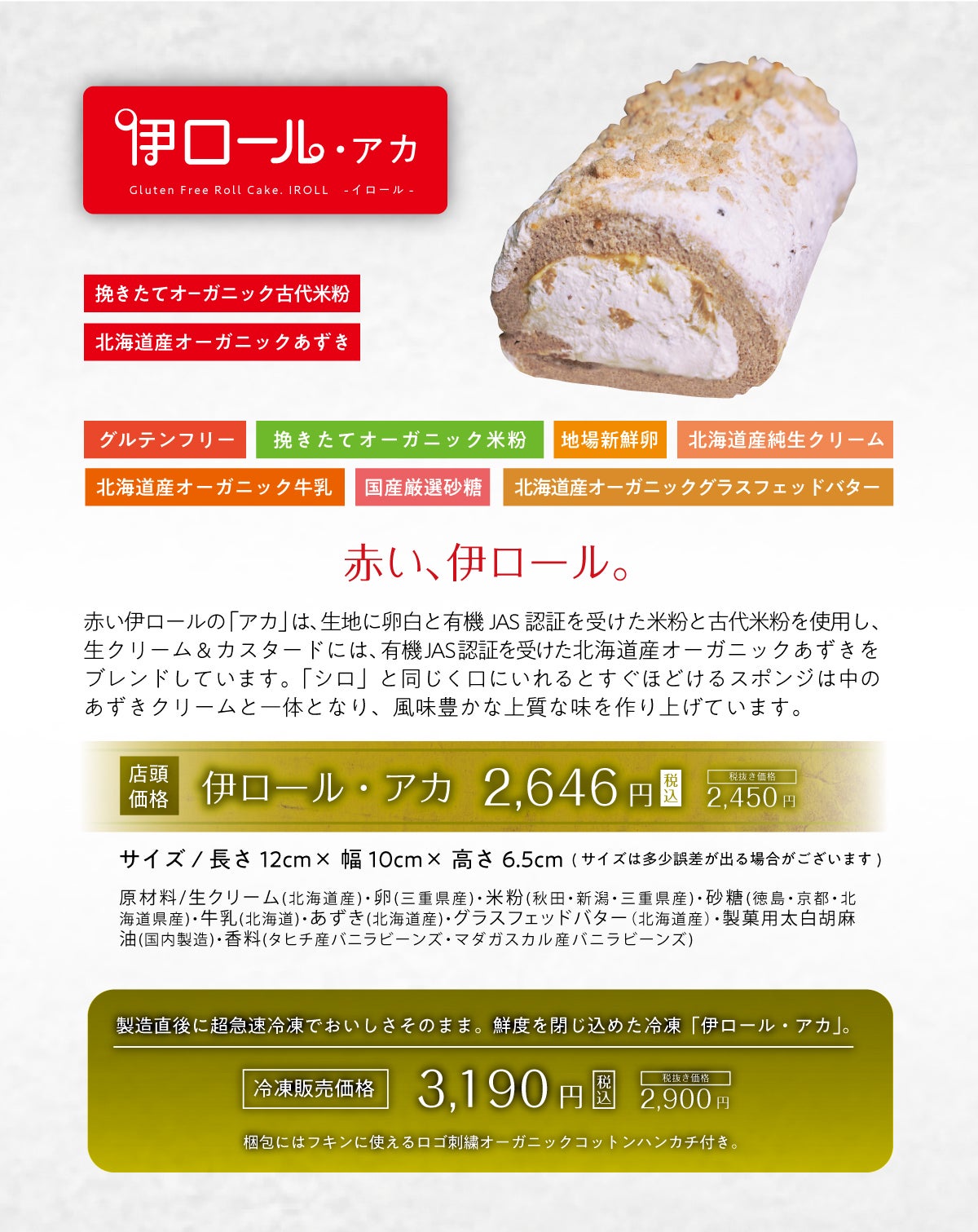 とろけるような食感と、一つ一つにこだわった材料、最大限の手間をかけて完成したこだわりのグルテンフリーロールケーキ「伊ロール・シロ」と「伊ロール・アカ」を完全予約制、店頭お渡しのみで販売をはじめております。