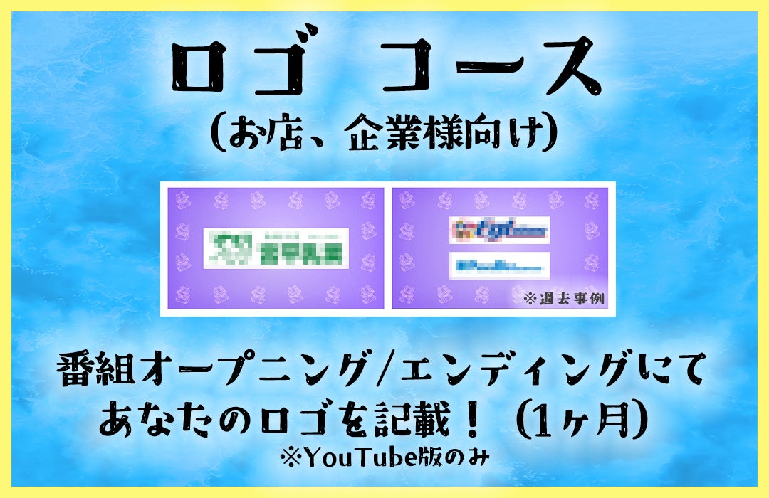 あなたの会社やお店のロゴを番組タイトル画面(オープニング+エンディングx番組二本、Youtube版のみ)に掲載します!