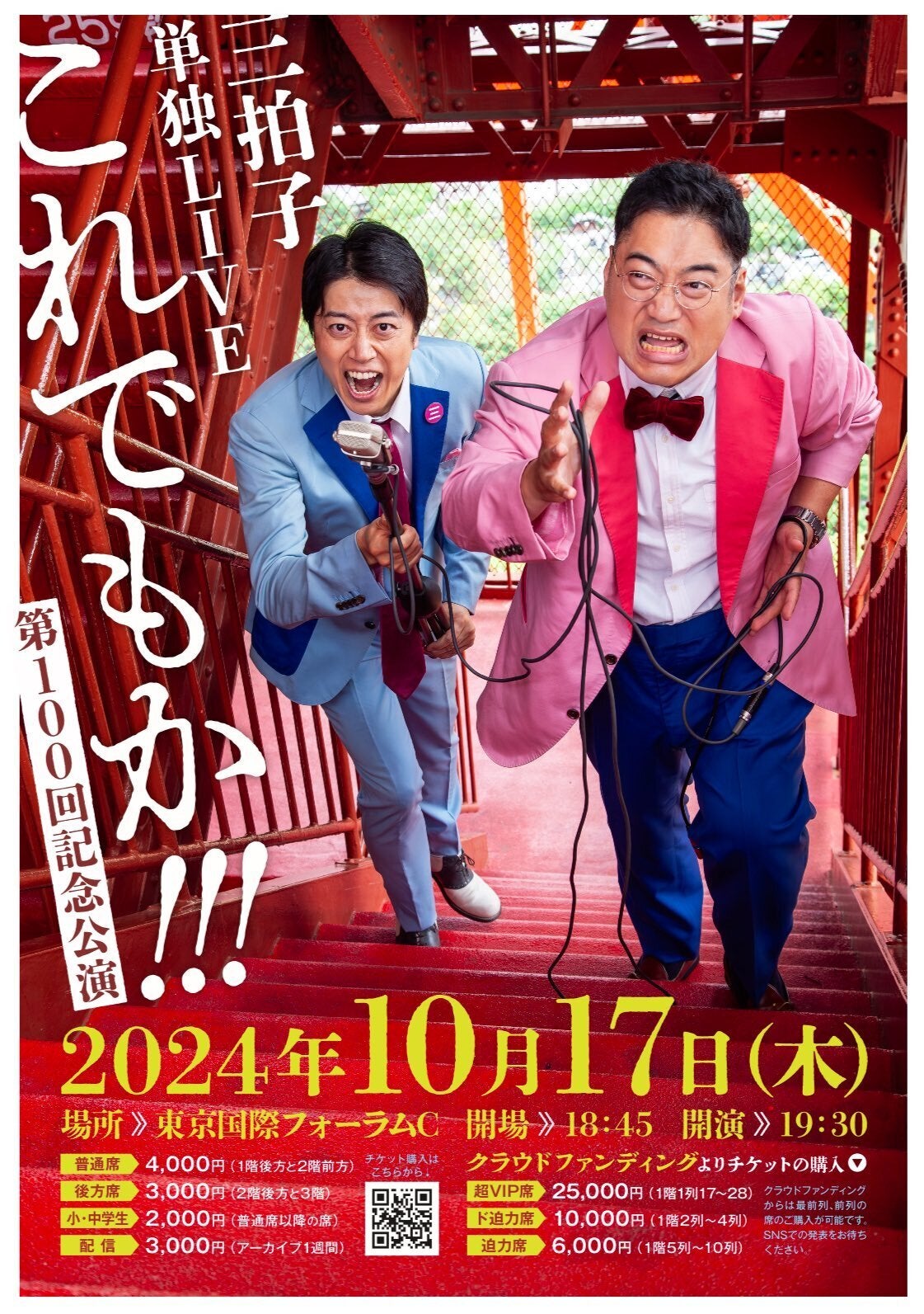三拍子が2024年10月17日に単独LIVE第100回記念『これでもか!!!』を《国際フォーラムCホール》で開催致します。