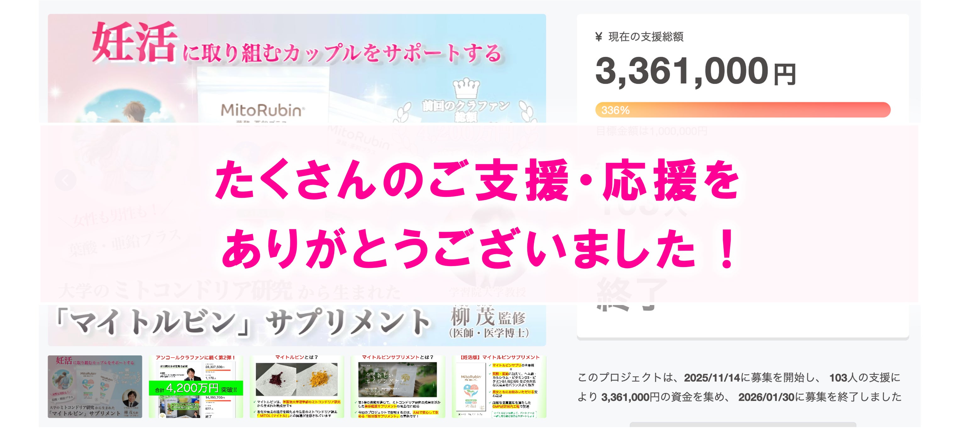 2026/01/31 11:11こんにちは!大学発ベンチャーのマイトジェニックです。妊活サプリ「MitoRubin サプリメント〈葉酸・亜鉛プラス〉」のクラウドファンディング開始から約2ヶ月半、本プロジェクトは、おかげさまで【達成率336%】 にて、無事終了となりました!あらためまして、ご支援・応援をお寄せくださった皆さまに、心より御礼申し上げます。のべ 100名以上 の方からご支援をいただき、大学のミトコンドリア研究から生まれた「マイトルビン」の可能性、そして、エイジングケアや、妊活に取り組む男女の栄養サポート という取り組みに、多くの共感をお寄せいただけたことを、チーム一同とても嬉しく感じております。■ 新サプリメントのお届けについて新サプリメントの製造につきましては、2月中のお届け を目指して、国内の FSSC22000登録 / GMP認定工場にて、現在、鋭意製造中 です。今後の進捗は、本活動報告、またはご支援者様向けの CAMPFIREメッセージ を通じて、随時お知らせしてまいります。エイジングケア版をご支援いただいた皆さまへのお届け時期 につきましても、同様に、別途あらためてご案内いたします。■ 新サプリメントの一般販売について本プロジェクトをきっかけに新製品を知ってくださり、「一般販売はいつからですか?」というお問い合わせも、多数いただいております。新製品の一般販売につきましては、ご支援者の皆さまへの初回発送を完了した後、MitoRubin® 公式ECサイトにて開始予定 です。販売開始時期が決まり次第、公式サイト等を通じてあらためてご案内いたします。◇ ◇ ◇最後になりますが、本プロジェクトを通じていただいた皆さまのご支援・応援は、研究・製品づくり、そして今後の情報発信に取り組む私たちにとって、大きな励みとなっています。この挑戦は、これで終わりではありません。「ミトコンドリアのケアが、私たちの生活の中で、当たり前になる世界」を目指して、引き続き、研究と開発を着実に進めてまいります。これからも、ミトコンドリア研究の成果を、皆さまの日々の健康に、どうつなげていけるか?という視点を大切にしながら、一歩ずつ歩みを進めてまいります。引き続き、温かく見守っていただけましたら幸いです。本当にありがとうございました! もっと見る