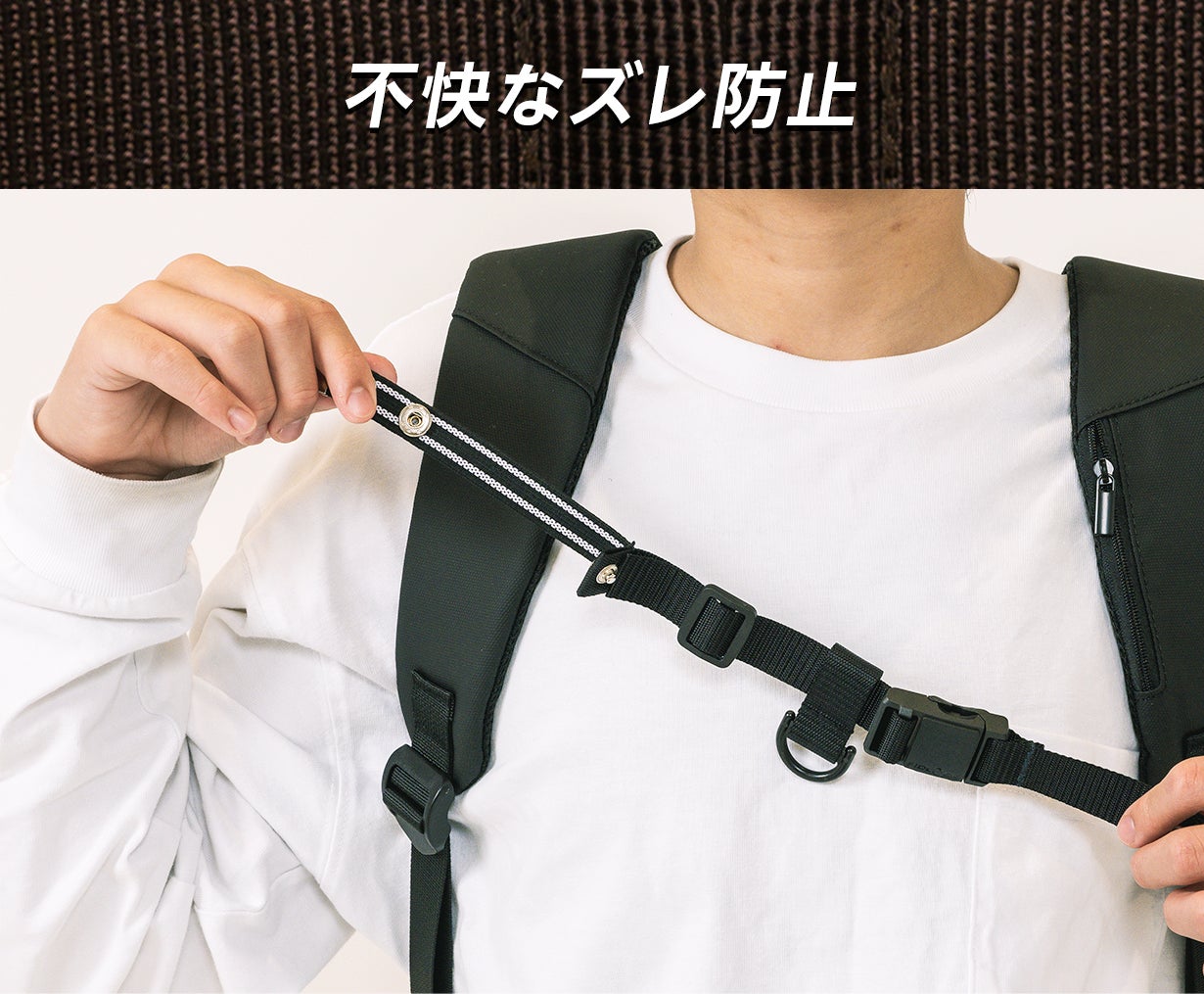 リュックで通勤、登山、ランドセルで通学、少し動くとリュックが肩紐からズレ落ちる。