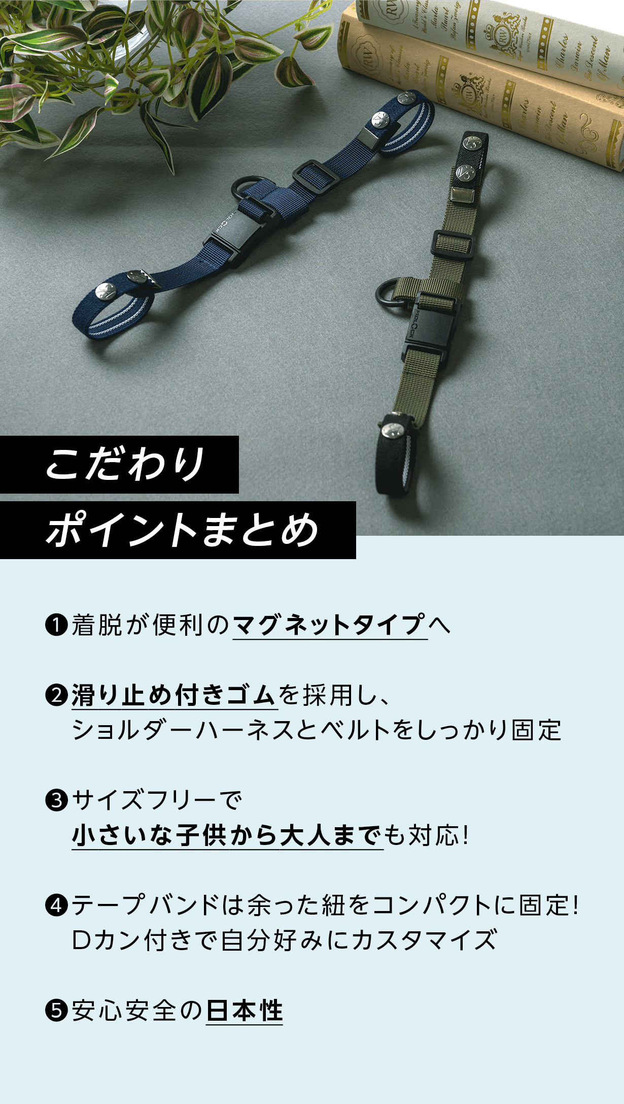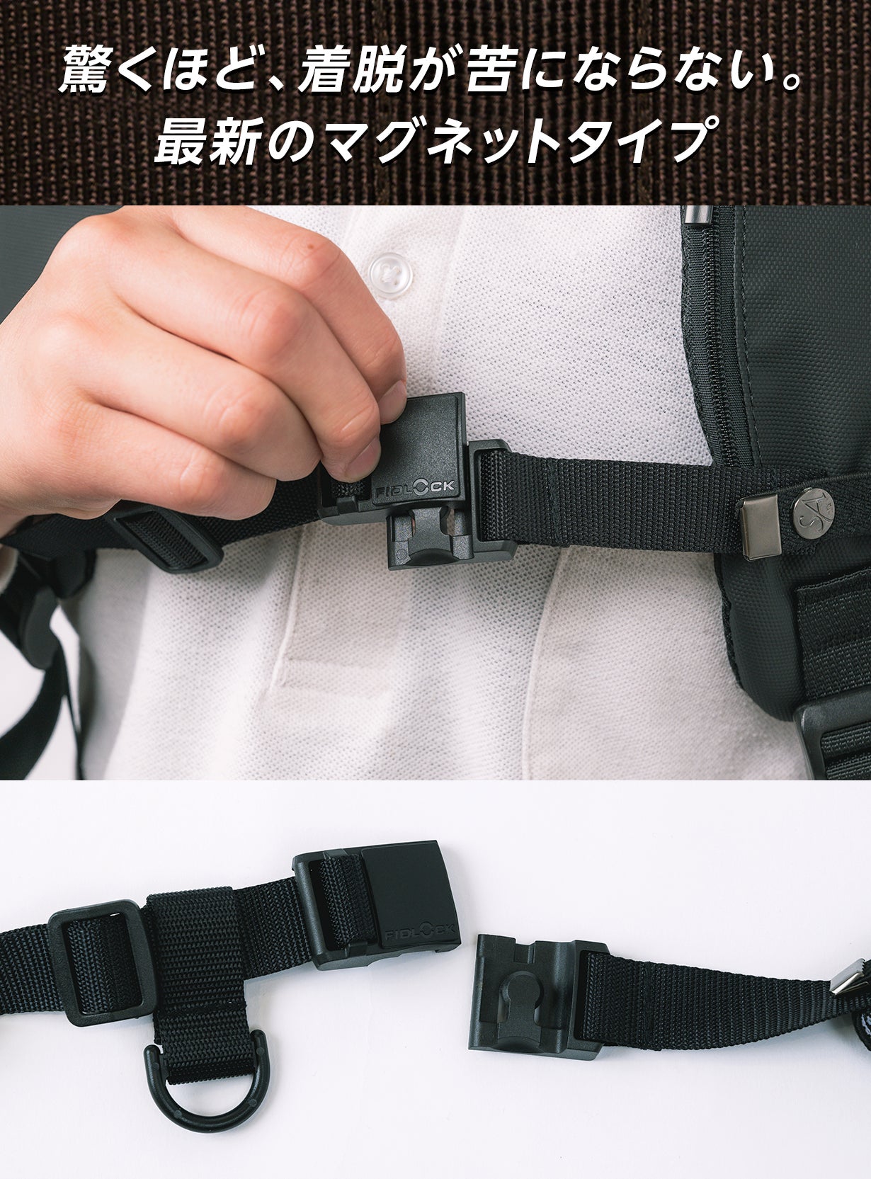 2. 機能性とデザイン性にこだわったチェストベルトがないこれらの機能に加え、さらに着脱のスムーズさを追求することにしました。
