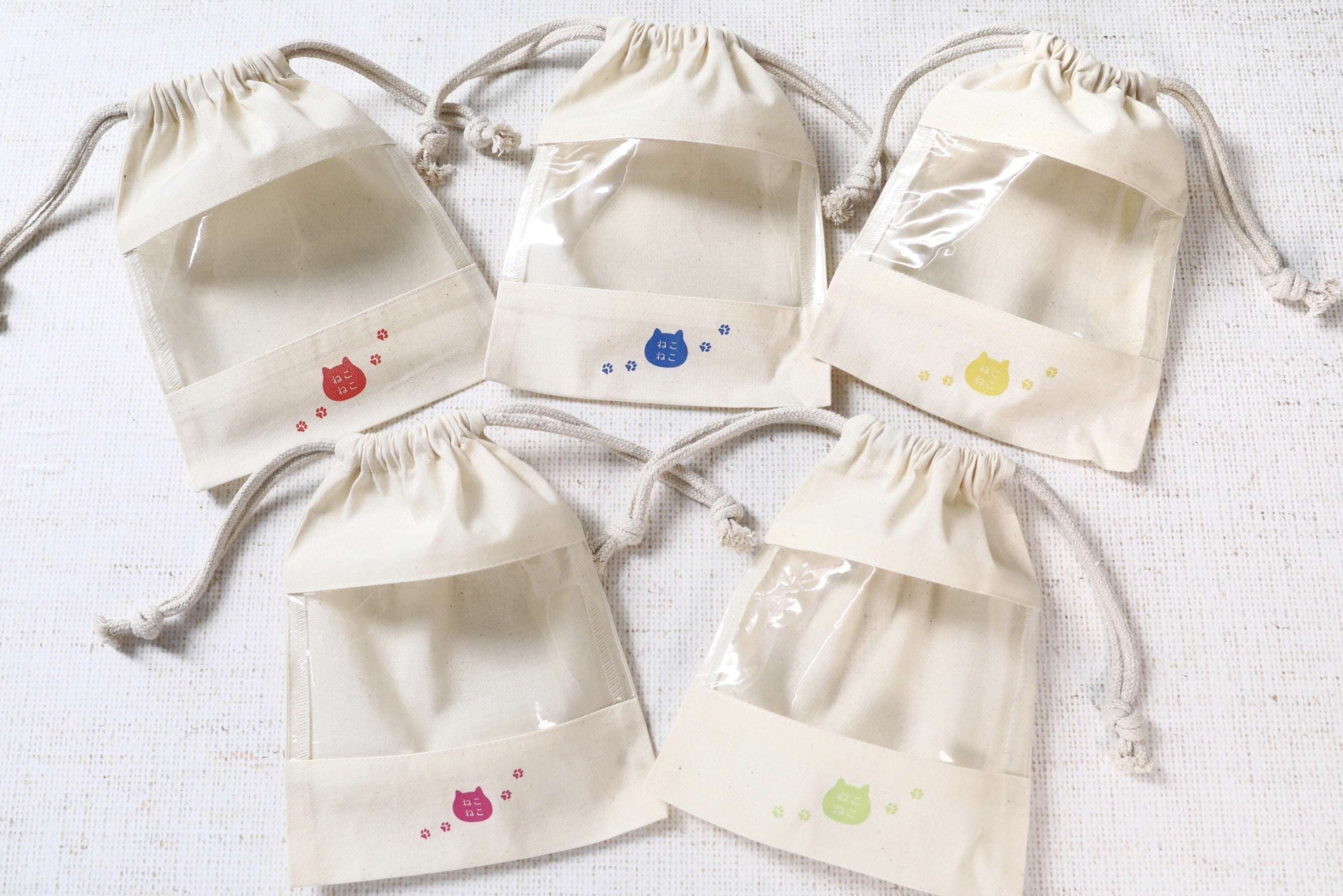 「ねこねこ」のロゴとにくきゅうがプリントされたかわいらしいアクリル巾着です。