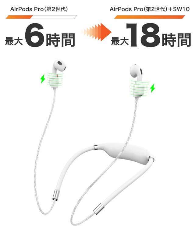 「SW10」は首にフィットするバッテリー内蔵型の充電器で、運動中や移動中などアクティブなシーンでの使用に適しています。450mAhの大容量バッテリーで最大18時間の連続使用が可能です。運動時の落下を防ぐ安定した装着感と、軽量設計が特徴です。