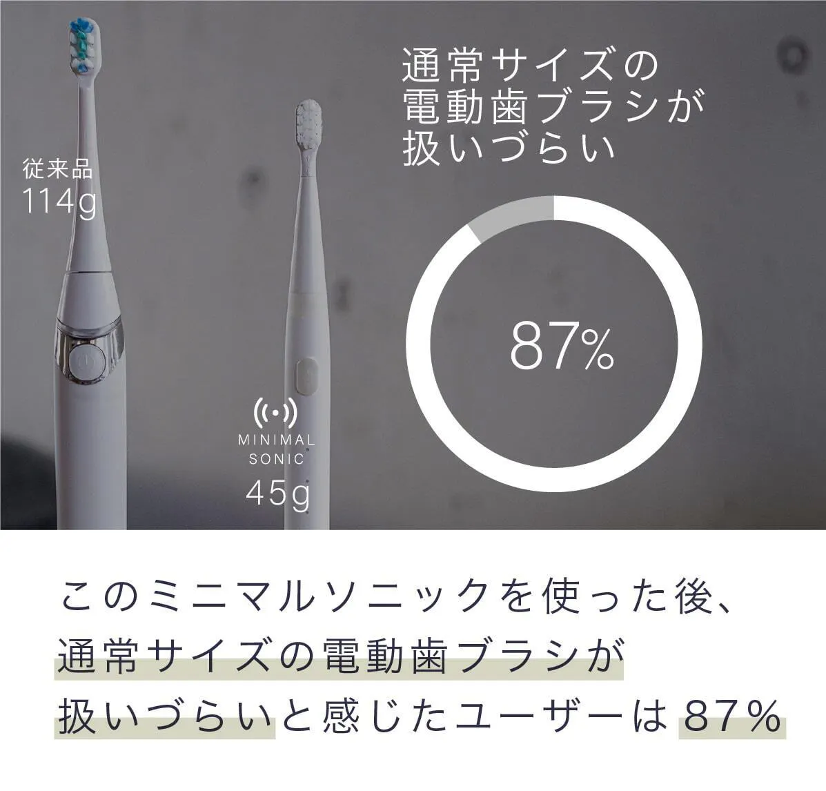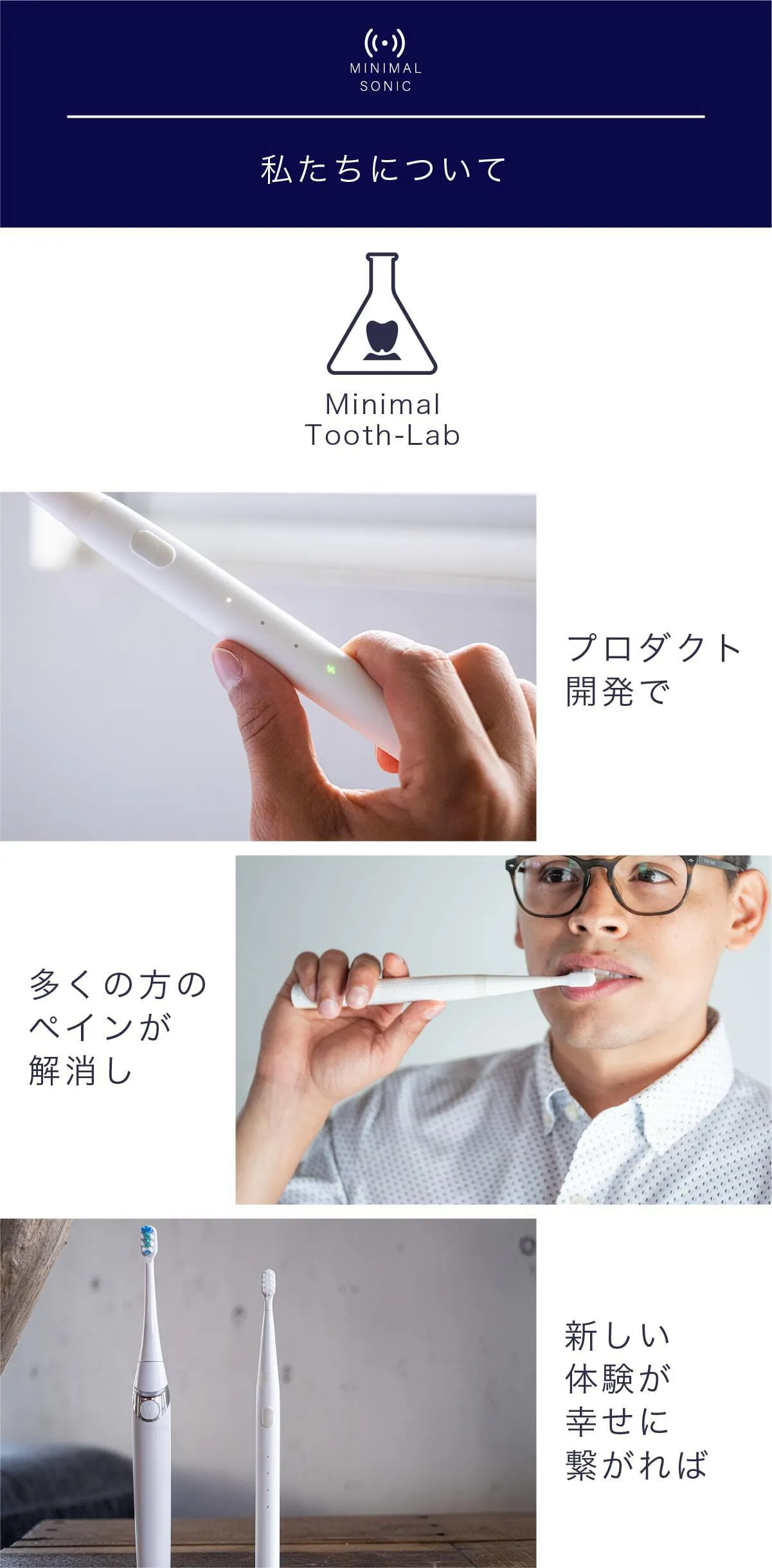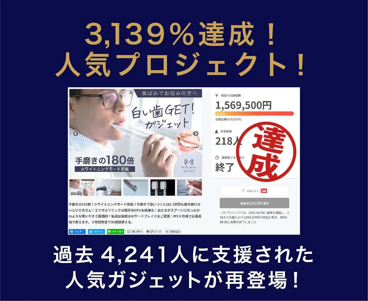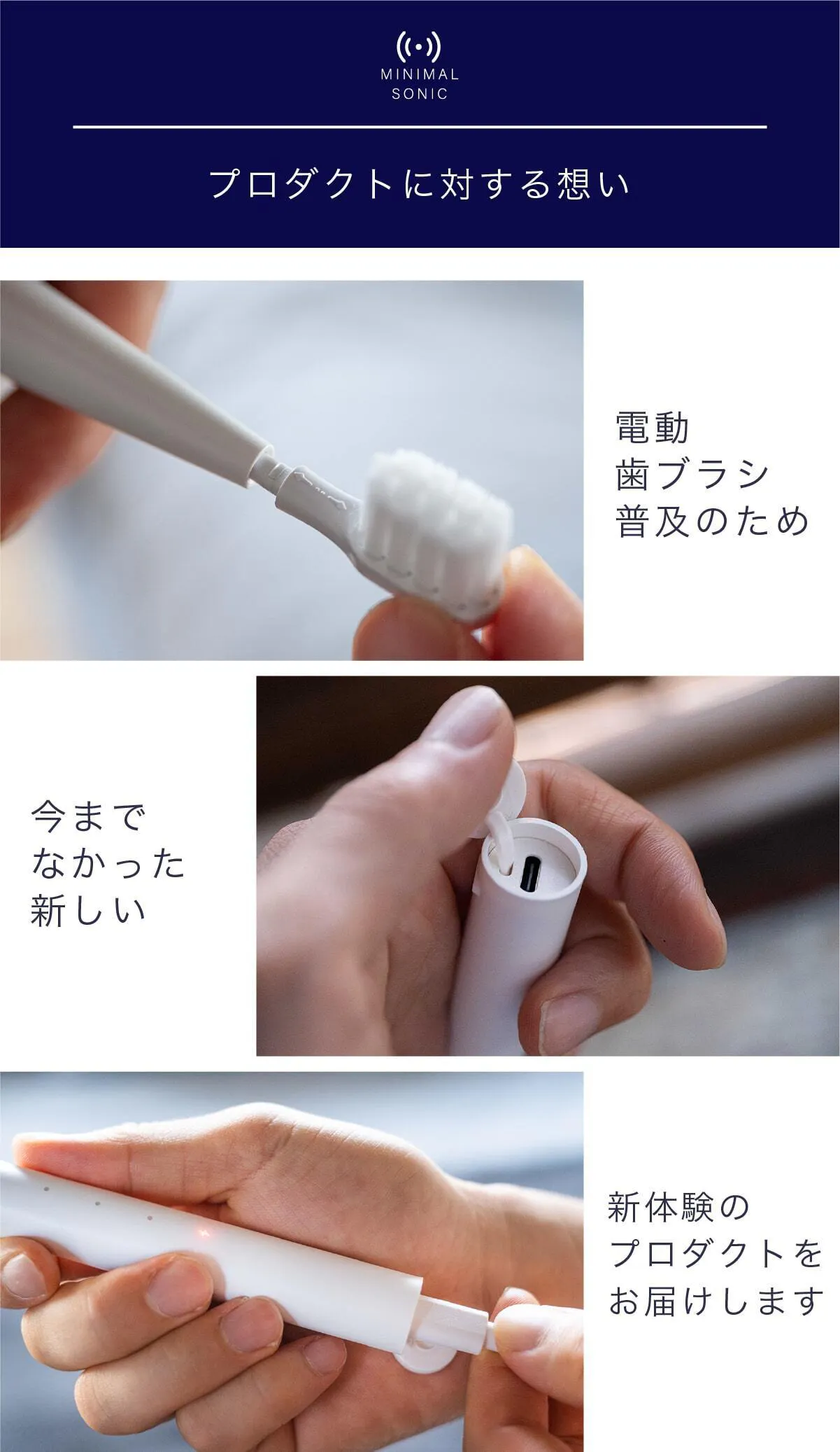 私達は日本の電動歯ブラシ普及率22%をなんとかしたいと考え、ミニマルソニックを誕生させました。口腔内のケアは大変重要なものであるにも関わらず、そのツールの進歩はまだまだです。ミニマルソニックが少しでも日本の電動歯ブラシ普及のきっかけになれば大変嬉しいです。