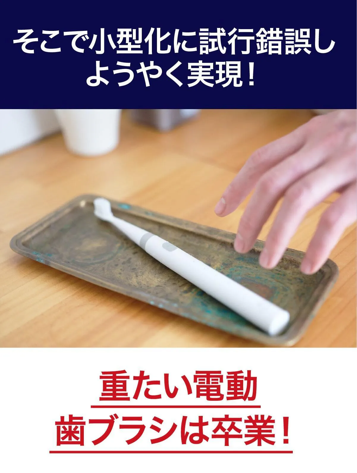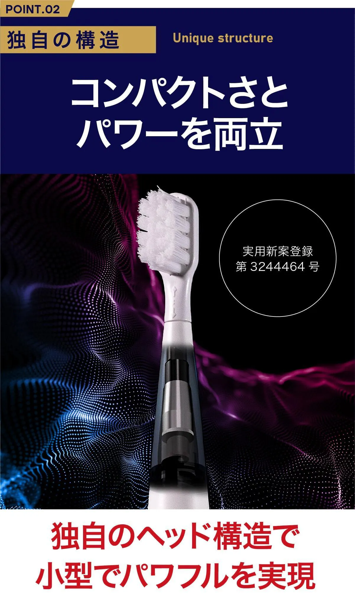これだけのパワーを小さなボディに収めるために独自の特殊設計を行いました。今までの電動歯ブラシとはまったく異なる構造にすることでようやく実現!