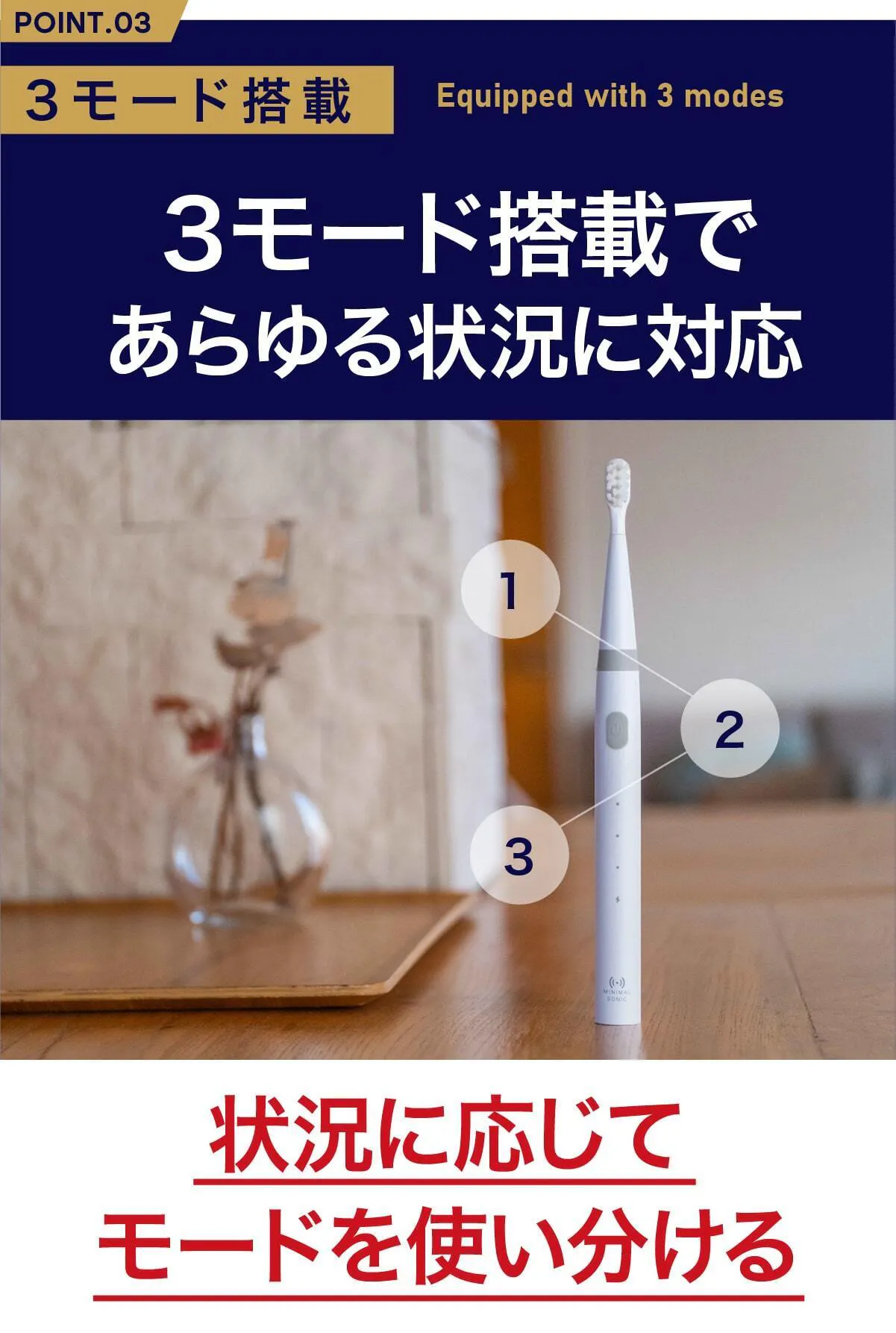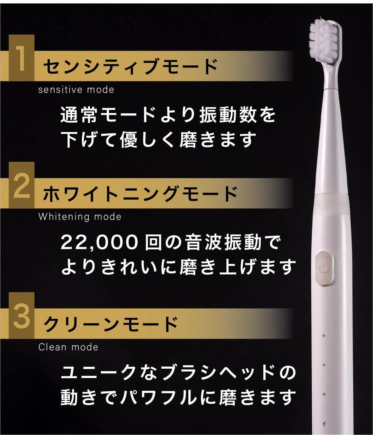 3つのモードを搭載し、あなたの歯磨きの状態によって最適な磨き方を選べます。電動歯ブラシに慣れない方には「センシティブモード」白い歯を目指す方には「ホワイトニングモード」汚れをかき落としたい方は「クリーンモード」でお口の中をきれいに。