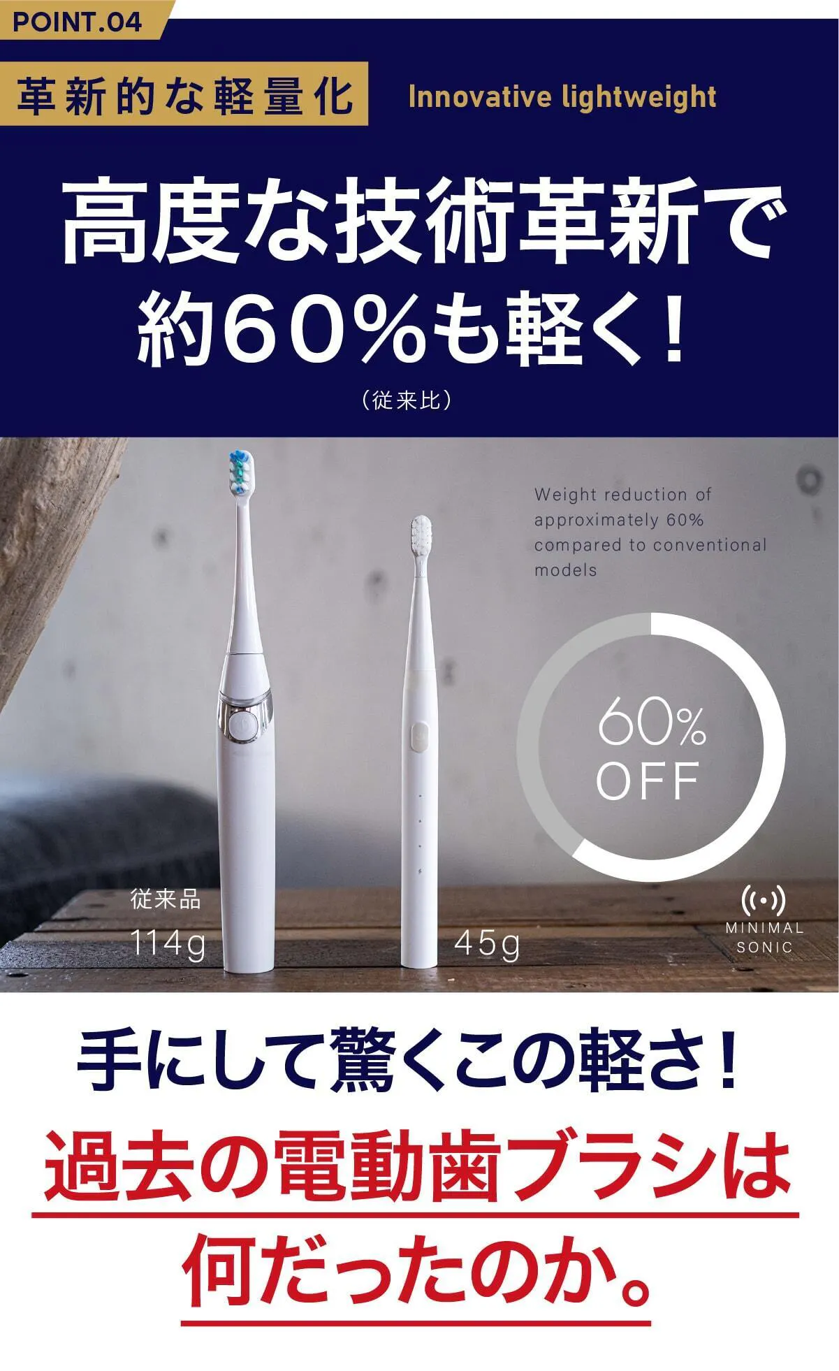 ミニマルソニックはパワフルなだけでなく、そのパワーを小さなボディに収めることに成功しました。高度な技術革新で約60%も軽くすることができたのです。