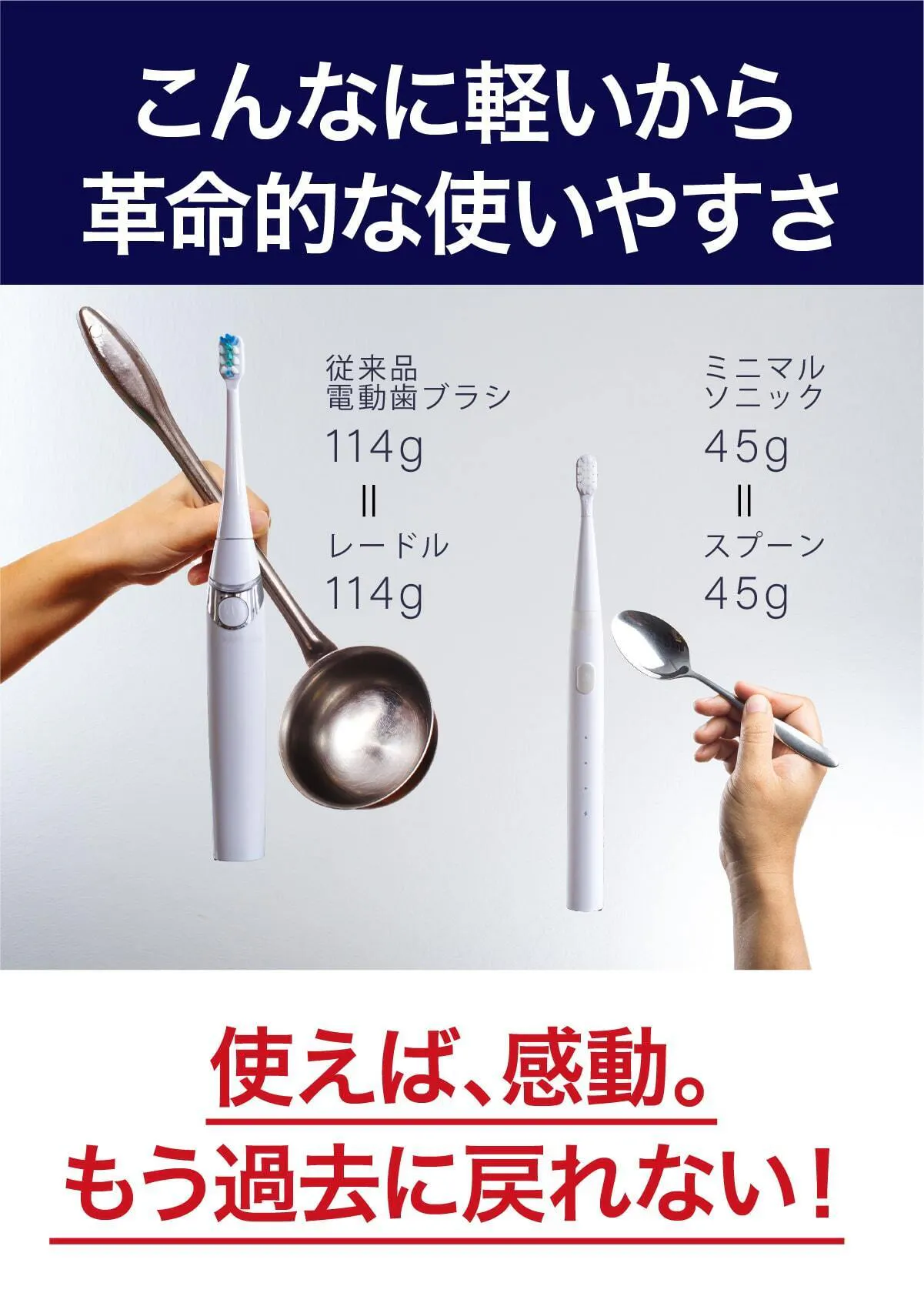 レードル(おたま)の重量は114g、これは従来の電動歯ブラシと同じです。スプーンの重量は45g、これがミニマルソニックと同じです。こんなに軽いから革命的な使いやすさを実現しました。