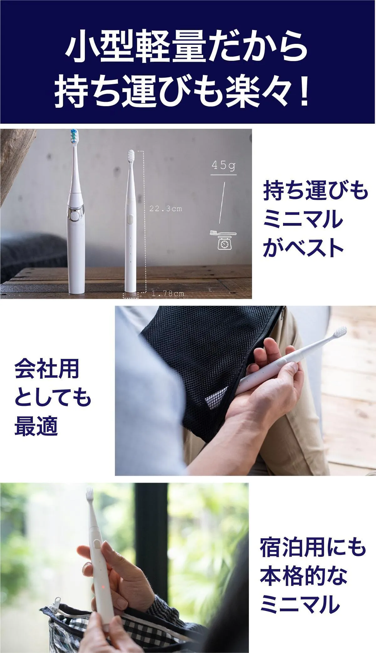 今までの電動歯ブラシを大きいと感じたことはありませんか?普通の歯ブラシから電動歯ブラシに変えた時にそれを大きく感じると思います。電動歯ブラシは構造上、大型化してしまうのですが、常識に囚われずまったく新しい電動歯ブラシを設計したのがこのミニマルソニックです。新発想の構造で小型でパワフル。未来の体験をはじめましょう。