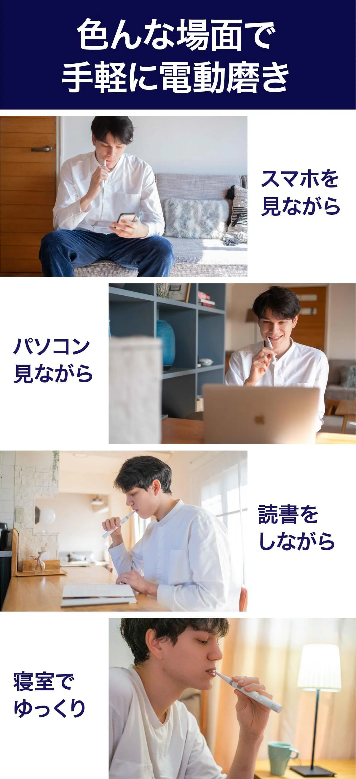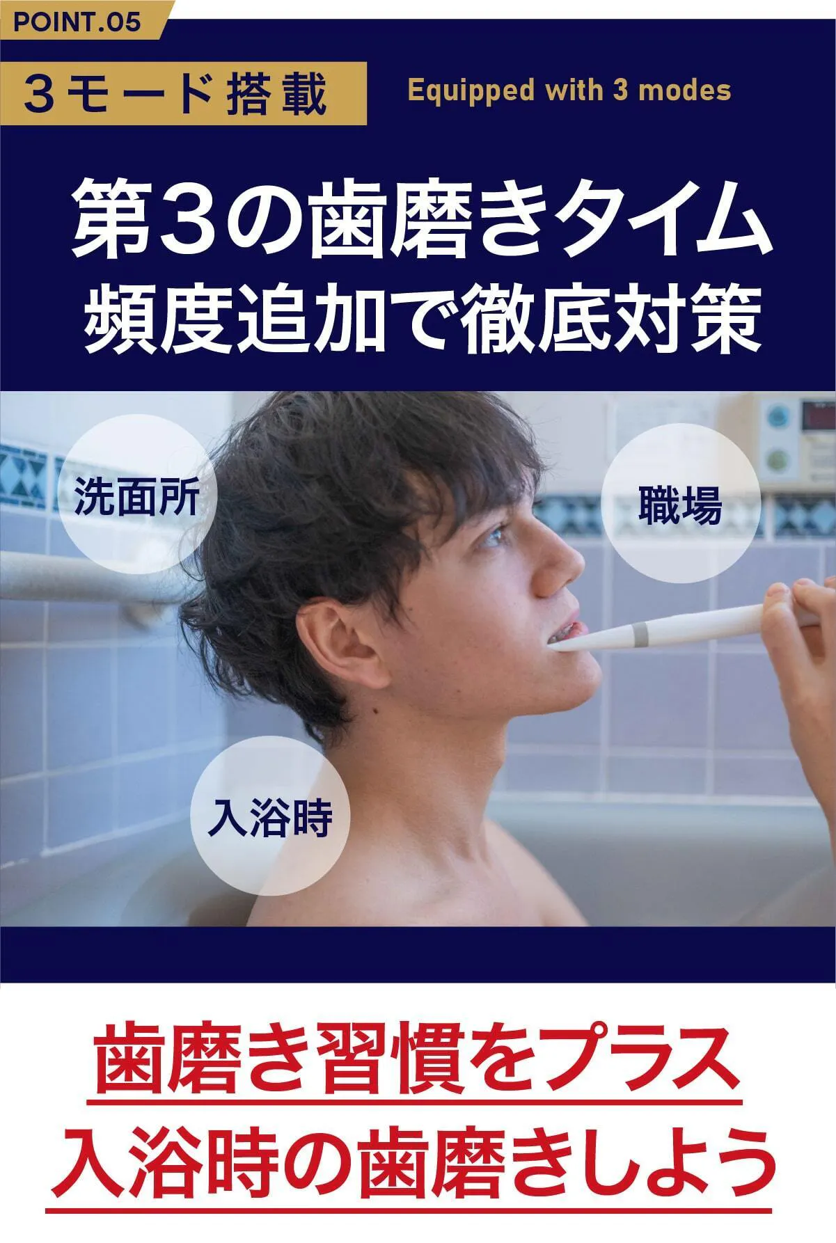 歯磨きは磨く回数が多ければより効果的です。私達は歯磨きのサードプレイスをご提案します!浴槽にゆっくり浸かりながら、ミニマルソニックタイムをプラスして下さい。入浴中の歯磨きは様々な歯科医も推奨しています。