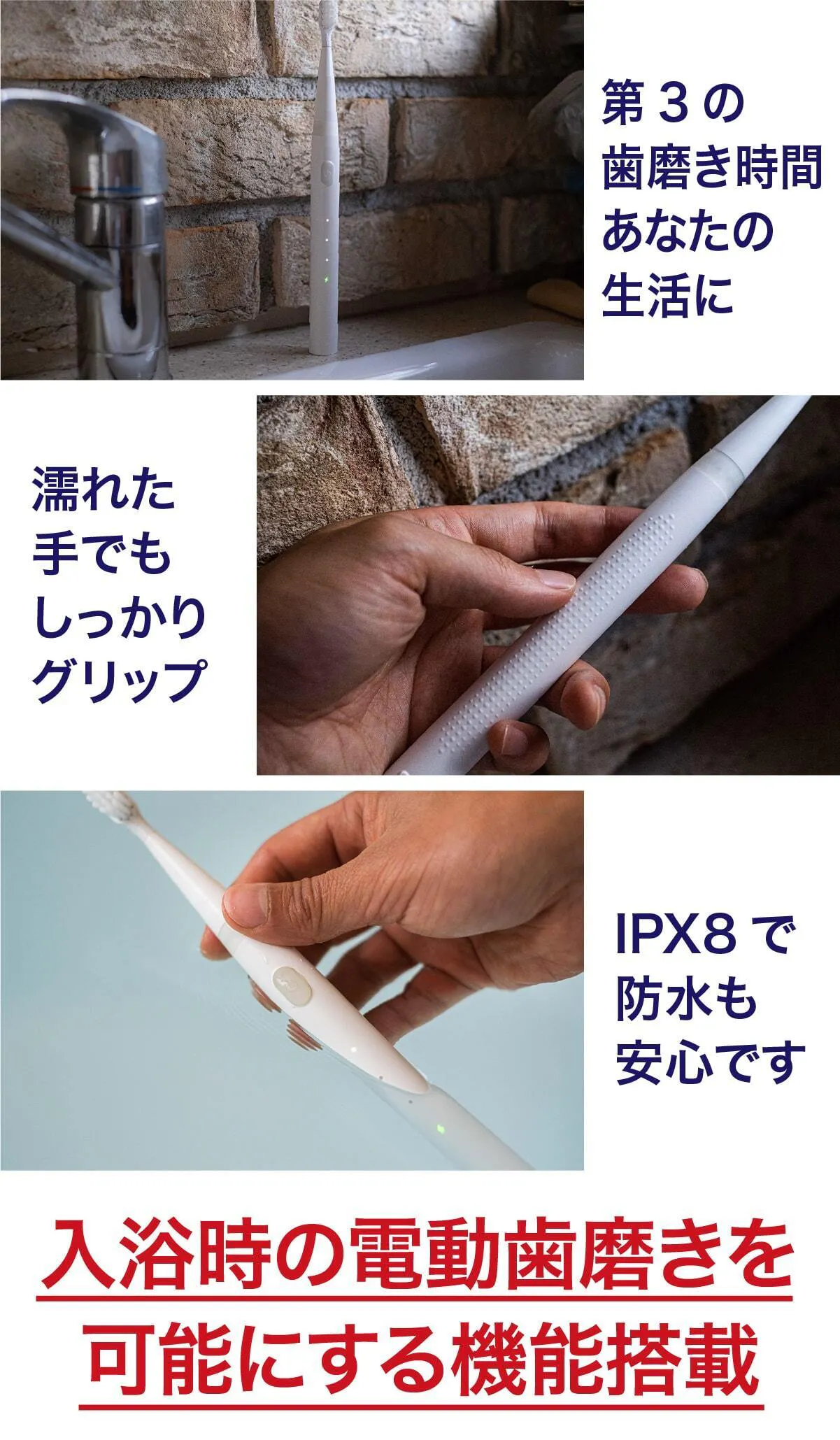 入浴中に歯を磨くには、防水機能の他に水滴などで磨く手が滑らないようにする必要があります。ミニマルソニックは「粒子グリップ」を搭載し、入浴中の歯磨きに最適です。