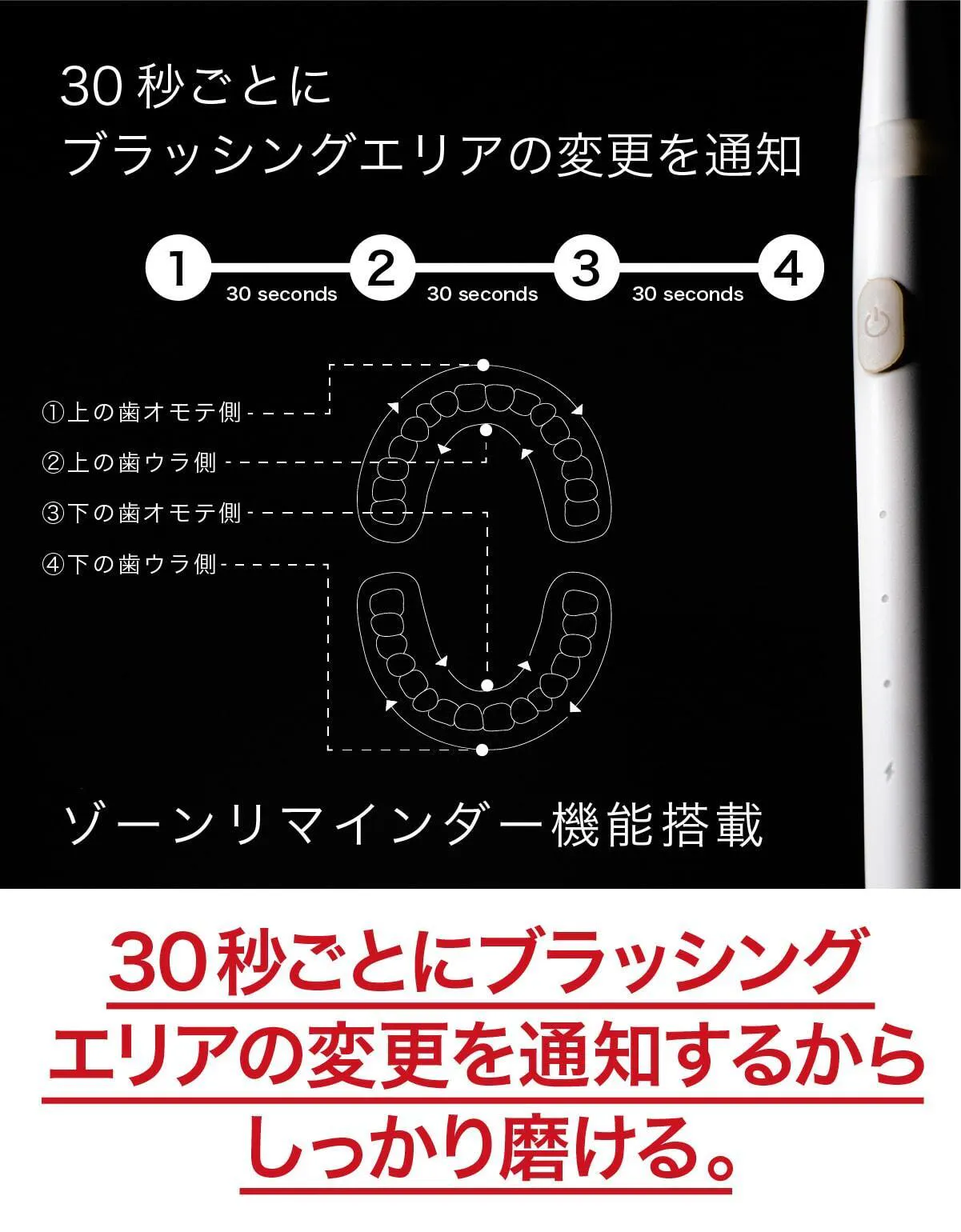 ゾーンリマインダー機能であなたが30秒磨く毎にバイブレーション通知が。上下と表裏の4箇所をしっかり磨くことができます。