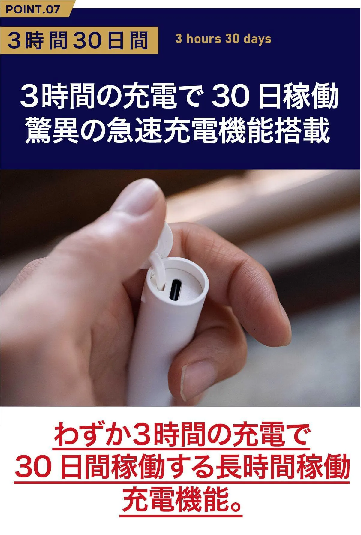 ミニマルソニックは長時間稼働を実現したタイプC急速充電を搭載。わずか3時間の充電だけで、なんと30日間も稼働します。