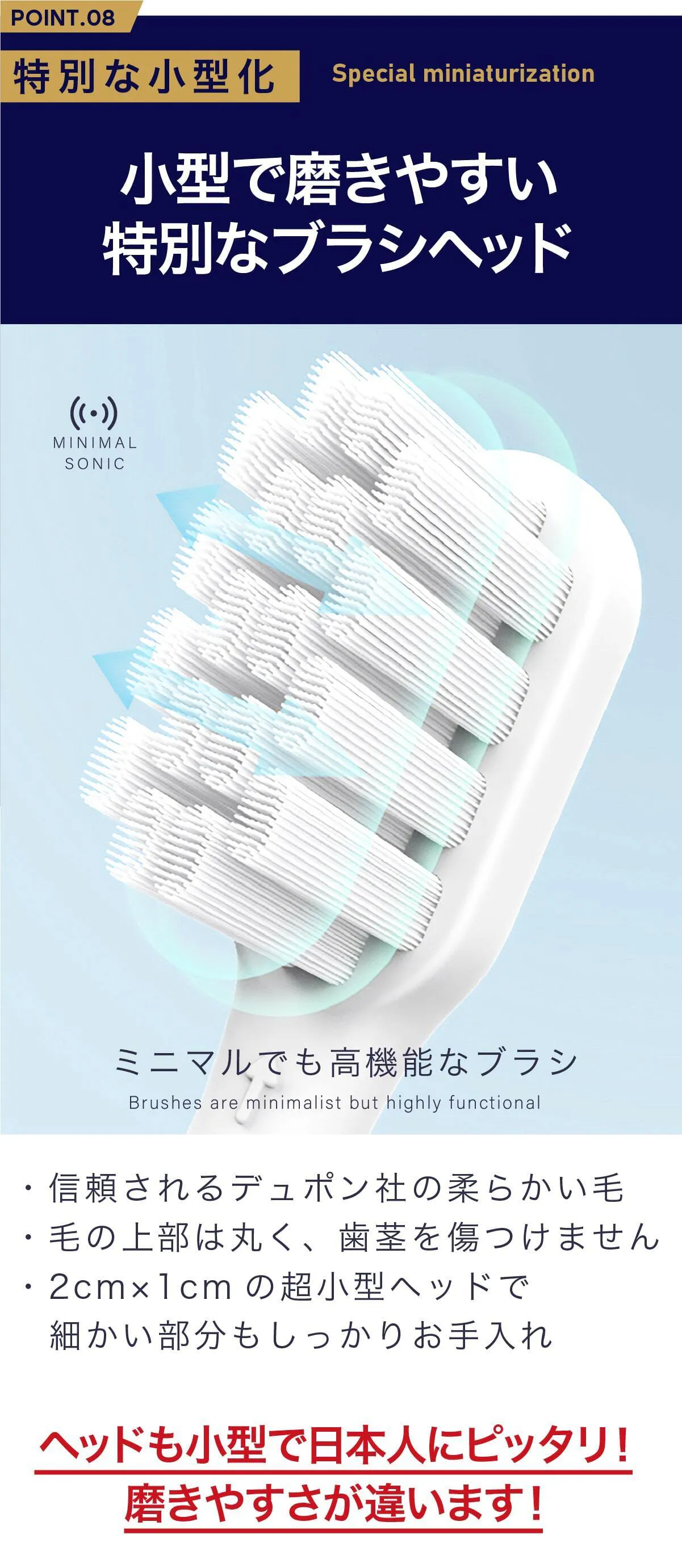 ブラシヘッドは高機能ながらも小型化していますので、日本人にぴったりです。細やかなコントロールが可能なのでしっかりと歯を輝かせます。