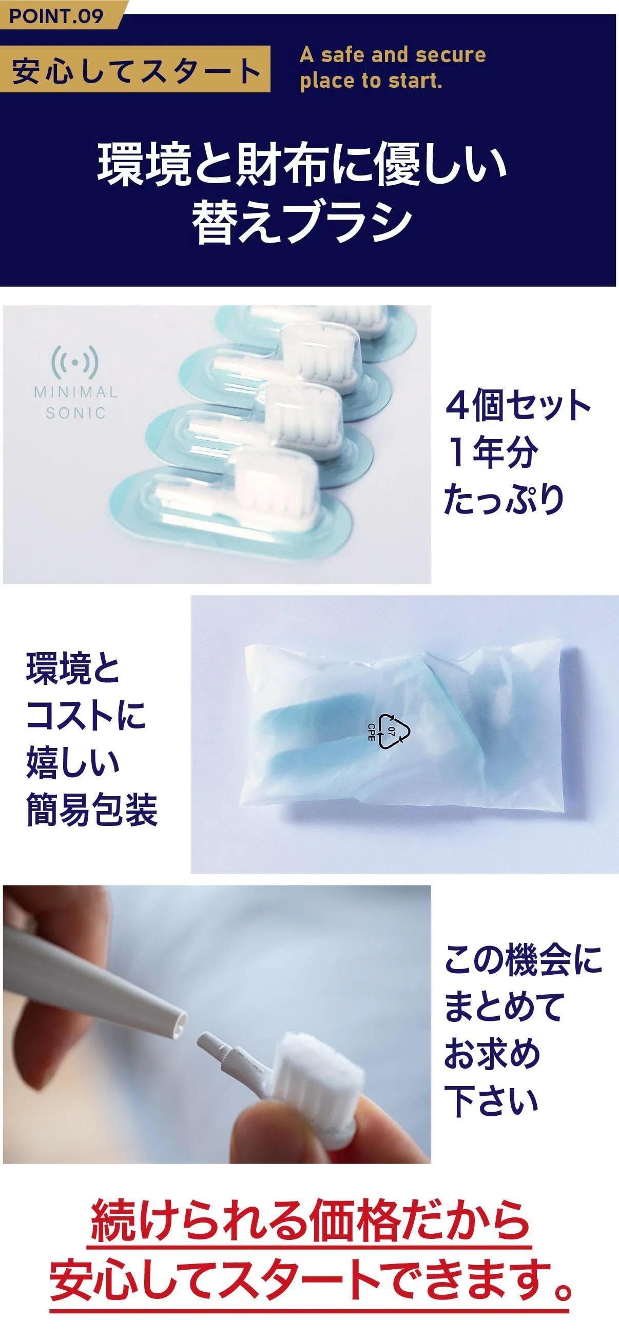 電動歯ブラシの替えブラシはなんであんなに高価なの!?続けられない!そう思ったことはありませんか?ミニマルソニックは構造上替えブラシを安価に生産できるのでコストパフォーマンス抜群です。