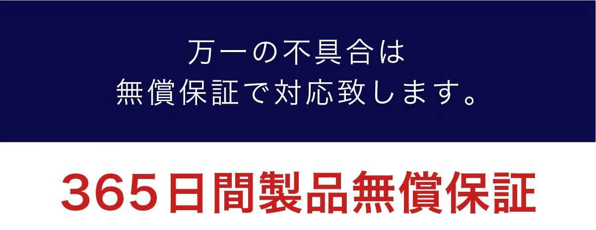 品質には自信がありますが、100%完璧な製品がこの世に存在しないように、私たちのプロダクトもほんのわずかな確率ですが不具合がでてしまうのも事実です。そこで、商品のお届けから365日間、不具合について無償で対応いたします。