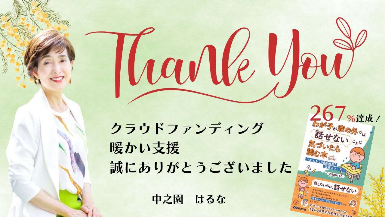 こんにちは、中之園はるなです。私は公認心理師として10年以上にわたり場面緘黙の子どもたちとそのご家族をサポートしてきました。この度出版するのが、これまでの経験と知識を一冊の本にまとめた「わが子が家の外では話せないことに気が付いたら読む本」です。このクラウドファンディングを通じて、場面緘黙の理解と家庭でもできることが沢山あることを1人でも多くの方に広めるために資金を募ります。