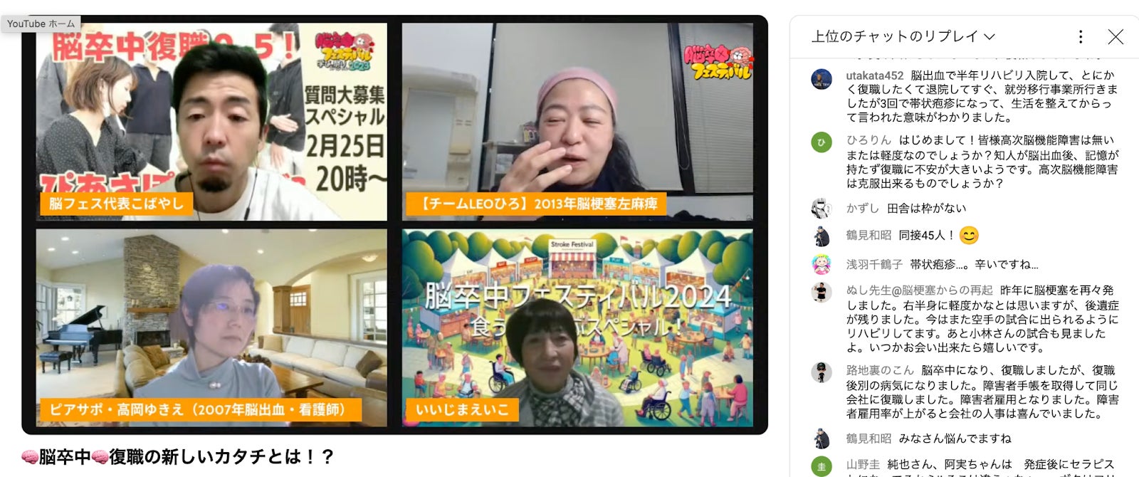 実際、毎週生配信しているYouTube「脳フェスチャンネル」でも、復職関連のテーマの際は視聴者数やコメントが倍増するほど。脳卒中当事者だけでなく、障がい当事者にとって厳しい現実があることを知りました。