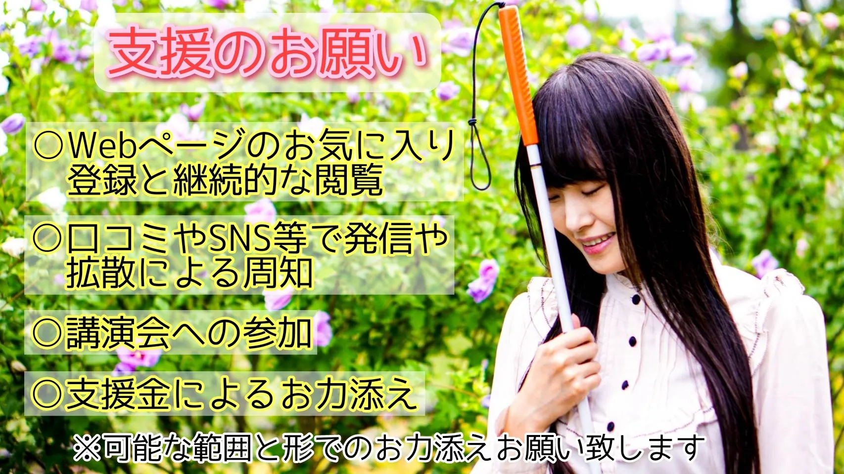 ぜひ、このページの継続的な閲覧とお気に入り登録、応援メッセージ、支援金によるお力添え等で、心のバリアフリーをすすめる活動を一緒にしていただきたいです。