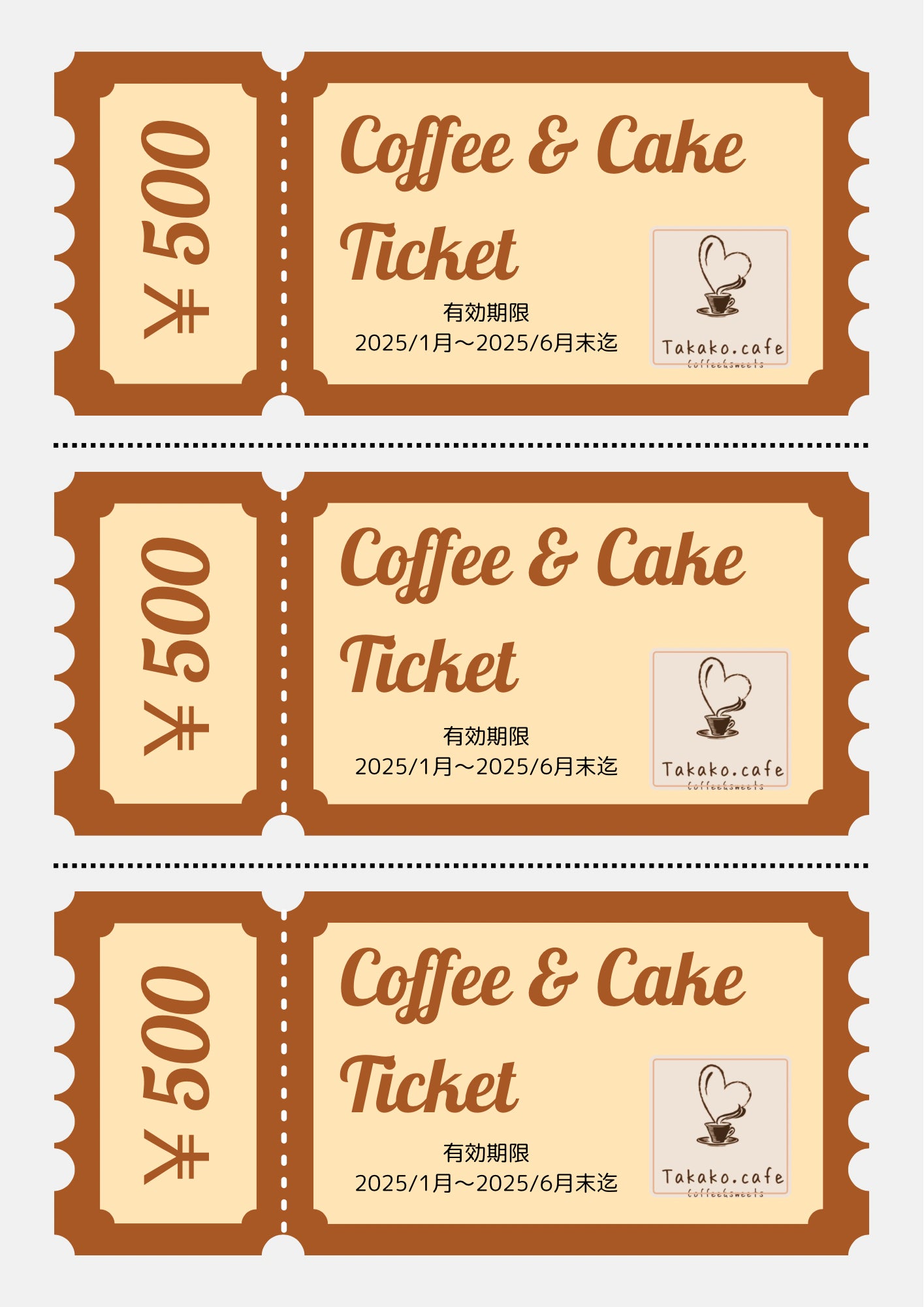 『コーヒー・ケーキチケット』は当店にご来店いただいた際に、お持ち頂きご利用ください。