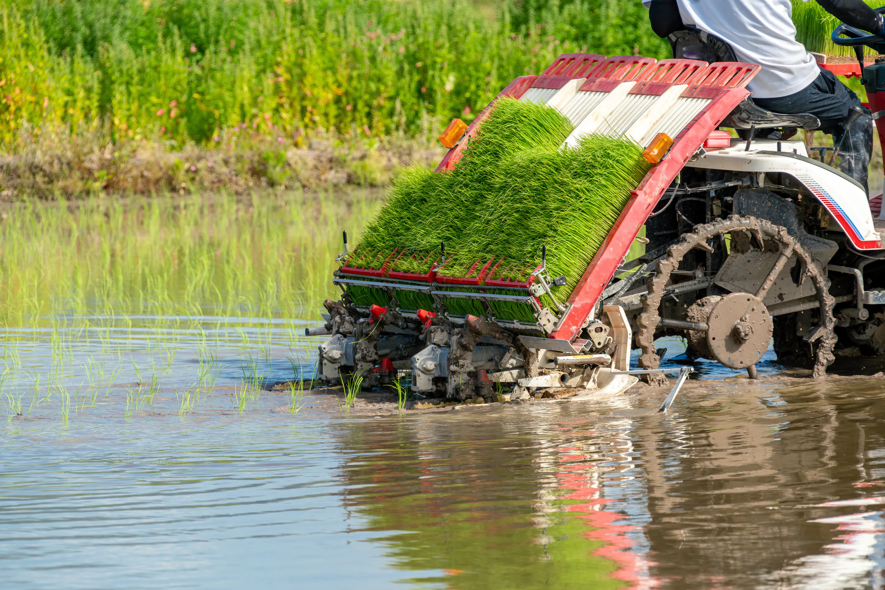 田植えをする直前に2回目の代かきを行い、すくすく健康に育った苗を田んぼに植えていきます。田植えを行った約1週間後から除草機を手で押し歩き、草の芽が小さいうちに除草します。