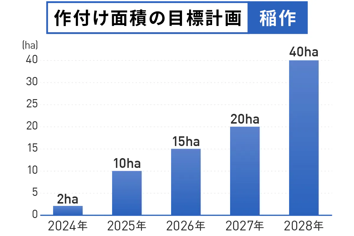 同時に、稲作の機械設備の購入について具体的な活動を開始します。2024年10月から40haの農地取得に向けて動きます。2027年12月までに40haを生産できる農機具がそろうよう取り組んで参ります。