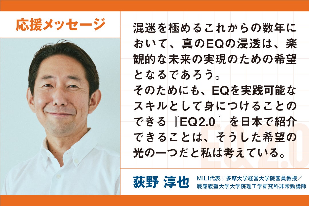 新たに刊行する『EQ2.0』日本語翻訳版の「解説」は、EQの普及と実践に携わり、リーダーシップや組織開発分野での深い知見を持つMiLI代表で多摩大学経営大学院客員教授の荻野淳也氏が執筆します。荻野氏は「『EQ2.0』が日本で再販されることを最も心待ちにしていた」と述べており、同書がもたらすEQの実践的な重要性や、EQの向上が日本社会の未来にもたらす恩恵について、最新のトレンドを交えた解説をいただきます。どうぞご期待ください!