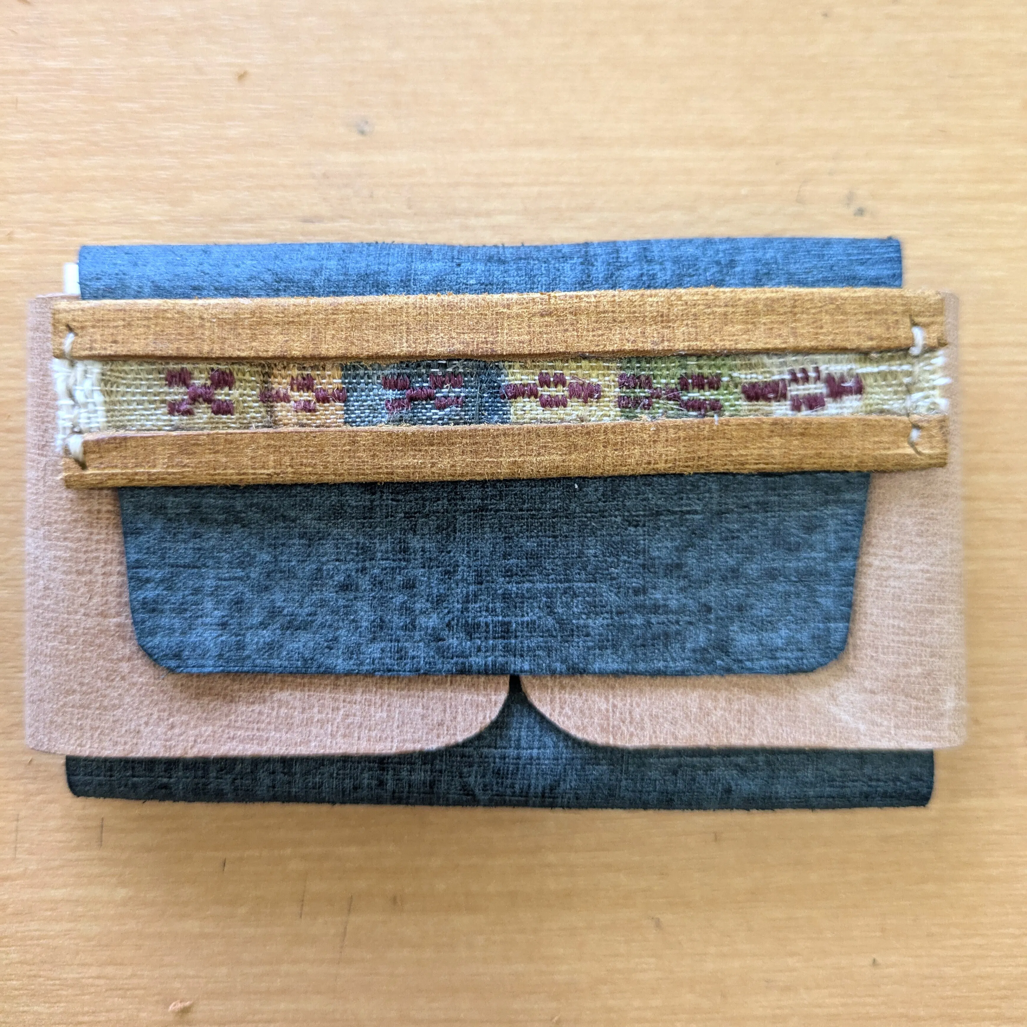 手織りの雰囲気に合わせた優しい風合いのイタリア製の革を使い、ワンポイントに手織り布をはさみこみました。使い込むうちに革と自然布どちらもつやが出て、色合いが濃くなってきます。