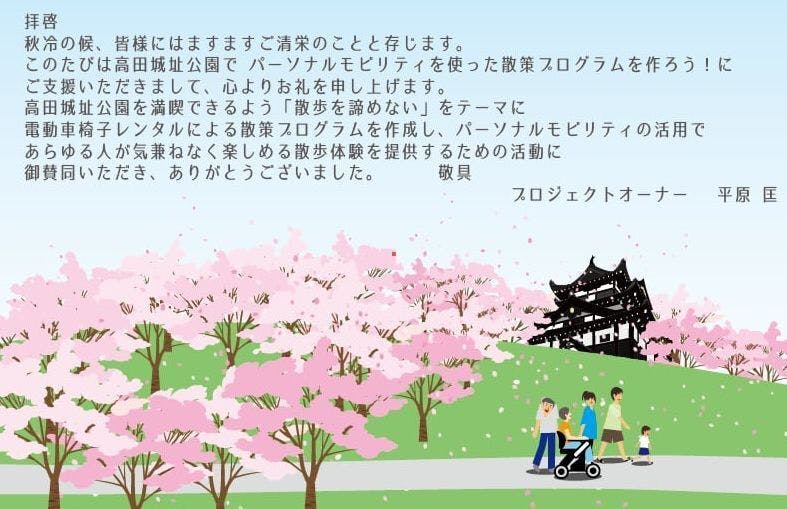 市内各地や全国各地にWHILLが配置されれば、外出がもっと楽しくなるでしょう。我が町の高田城址公園にもそのような環境が整えば素晴らしいと思います。この実証実験にご協力いただき、ユニバーサルツーリズムに対応した街になるようご支援をよろしくお願いいたします。