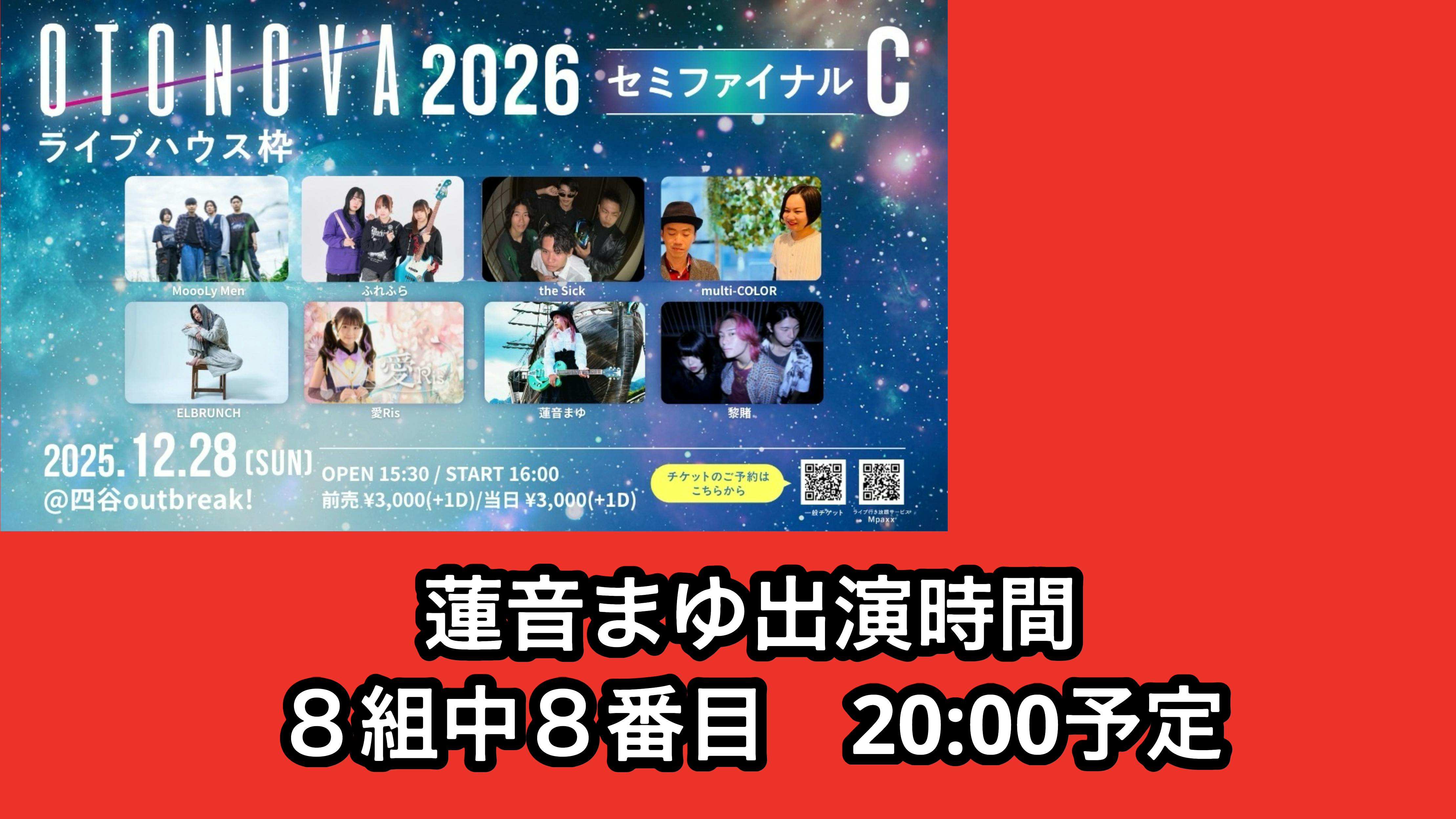 2025/12/27 15:12リスナーによる投票での勝ち抜き戦!得票数1位で決勝ステージ、Zepp新宿へ駒を進めることができます。無料配信、ご来場での投票・応援何卒どうぞよろしくお願いします!お力貸してください‼蓮音まゆコンテスト挑戦中ご来場、ネット投票できます。12/28(日)四谷アウトブレイク OTONOVA2026準決勝セミファイナル■ 勝抜組数:1組■ 会場:四谷outbreak!■ イベント開催日:2025/12/28■ OPEN:15:30■ START:16:00■ TICKET:前売り3000円 当日3000円■ その他料金:1D『Mudia配信&投票ページ』https://mudia.tv/event/4862(録画もどなたでもみれますが投票出来る時間帯は12/28の16じから24じ)投票には、mudiaアカウント無料登録必要mudia https://mudia.tv投票方法は、3つ1 無料ポイント 上限5000ptまで2有料ポイント 3000円でGを買いOTONOVA応援ギフトに交換して投票3ライブハウスに来るとOTONOVA金の投票券がもらえて、投票最大3種類の投票可能無料ポイントのみも可能無料ポイントのみ投票も大歓迎です。もし、有料ポイント投票出来そうな方は、3000円かかってしまいますが無理ない程度に、OTONOVA応援ギフトの投票券を買っての投票のご検討お願いします。準決勝 蓮音まゆ12/28のネット投票方法とネット投票券買い方 動画https://youtu.be/eBYMsV4xTi0?si=OdbrqxZzyX2IR3Px @YouTubeより蓮音まゆ出番 8番目ラスト20じ特設 蓮音まゆOTONOVA2026 https://hasunemayu.jimdofree.com/2025-26otonova2026challenge/ もっと見る