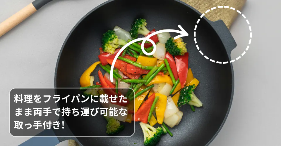 「WOKY Hahapan2.0」なら、ハンドルの反対側に小さな持ち手が付いているので両手でフライパンを持って移動することが可能です。