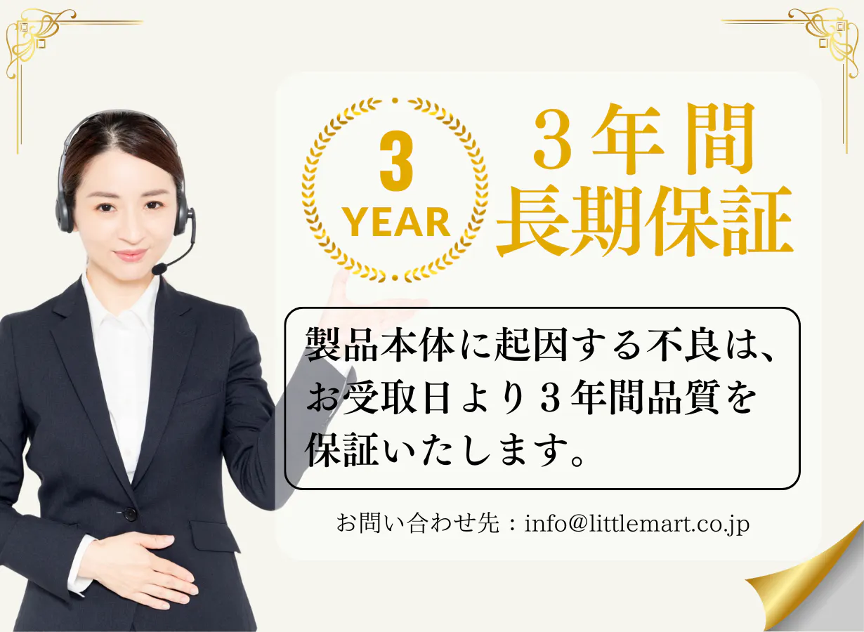 製品本体に起因する不良に関しましては3年間の保証がついています。同封されている保証書をご確認の上ご使用ください。