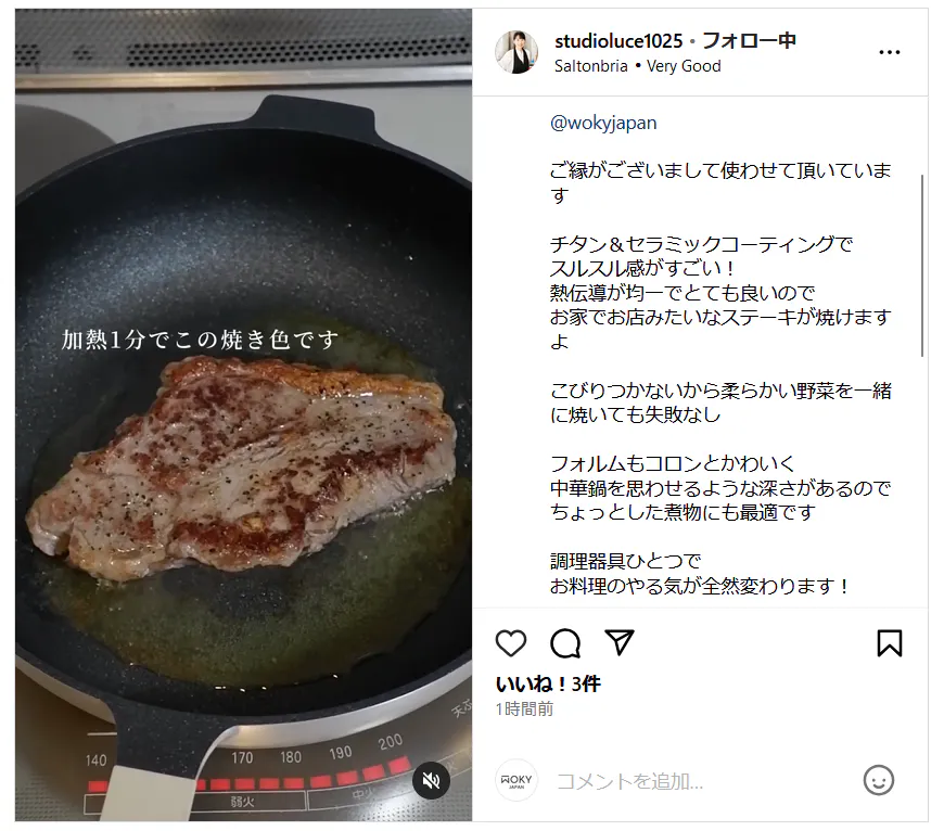 原田先生にはシンプルだけど意外と失敗しやすい「ステーキ」を焼いていただき、感想をご自身のInstagramにいただきました。