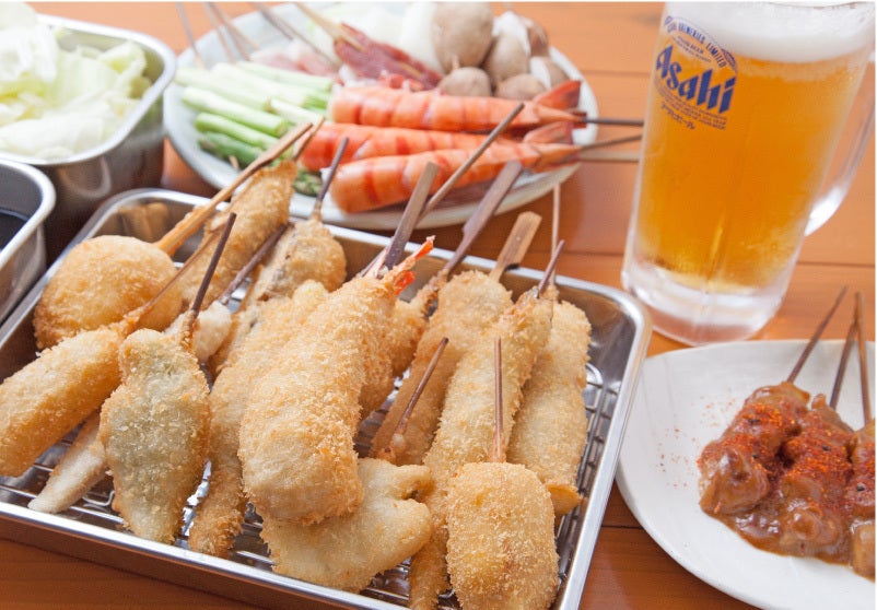 大阪・通天閣のお膝元「新世界・ジャンジャン横丁」で昭和24年に創業。平成20年(2008年)に店主の地元東大阪に移転してきました。新世界時代を知るオールドファンから地元のファミリー層まで、幅広い客層に愛される串かつは、大き目のネタに外はカリカリ、中はフワフワの衣をまとわせてさっくりアッツアツでご提供します。