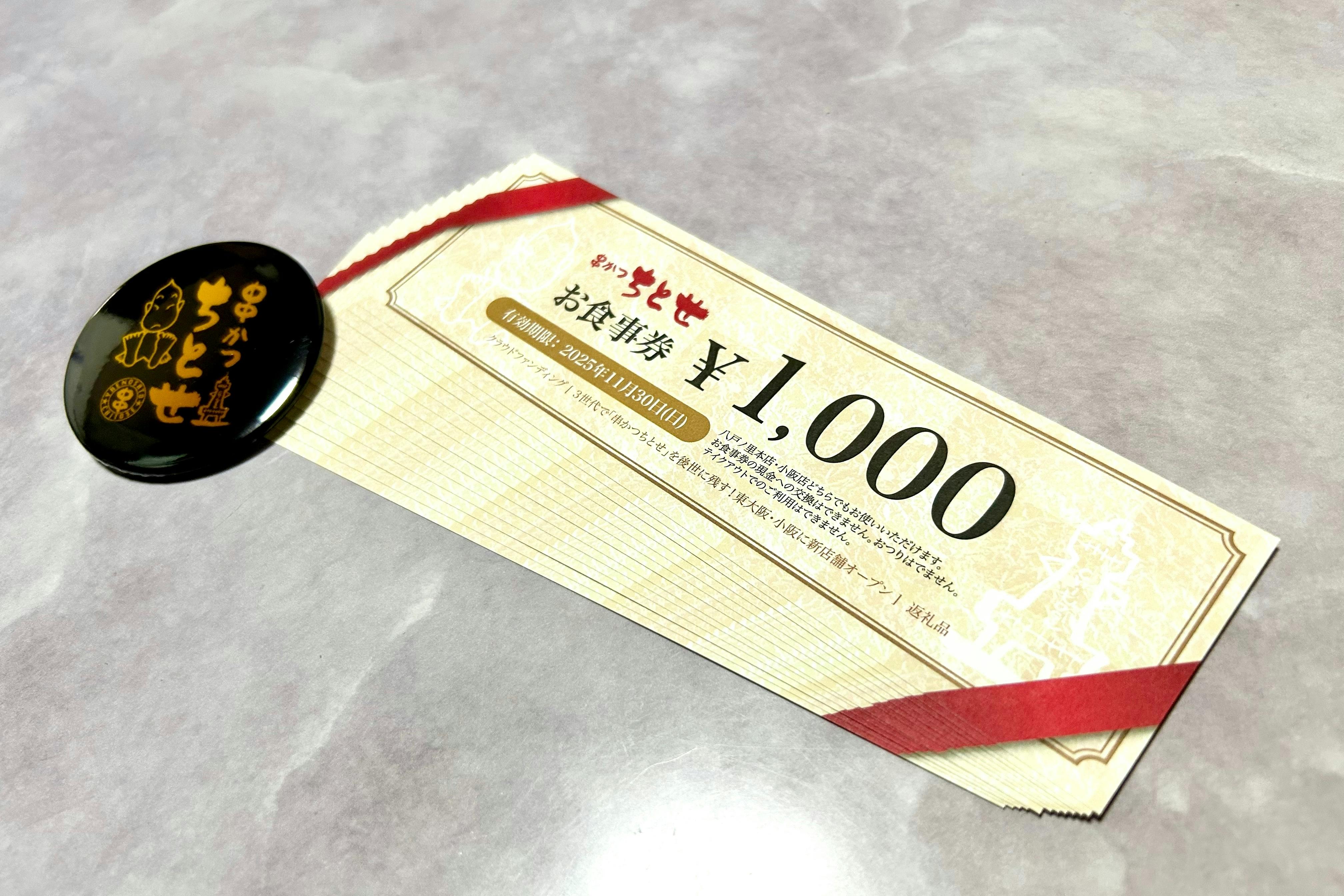 2024/11/13 14:30こんにちは、串かつちとせです。ご支援いただいた皆様ありがとうございます。現在、ご支援いただいた皆様へのリターンの実施に取り組んでいます。店舗受け取りをご選択いただいた方のお食事券の準備が整いましたので、お知らせします。【対象】お食事券にご支援をいただき、店舗(八戸ノ里本店or小阪店)でのお受け取りを希望される皆さま※お食事券(+缶バッジ、お礼文)以外は今回のお知らせの対象外です。【内包物】・ご支援いただきましたお食事券・オリジナル缶バッチ(柄はランダム)・お礼文となります。本日11月13日よりお受け取り可能です。事前にご選択いただいております、「八戸ノ里本店」または「小阪店」での受け取りとなります。あらかじめご自身が選択された店舗をご確認の上、ご来店ください。両店舗営業時間内(17:00〜23:00)にお引き取りにお越しくださいませ。定休日は八戸ノ里本店が月曜日・第3火曜日、小阪店が月曜日となっております。不足・お問い合わせ等ございましたら、メッセージまたはメールにてご連絡ください。また他のリターンにつきましても鋭意作成・準備中です。11月25日頃までに全ての発送を完了する予定です。順次ご案内いたしますので、今しばらくお待ち下さい。 もっと見る【リターンお届け状況】お食事券を発送いたしました。