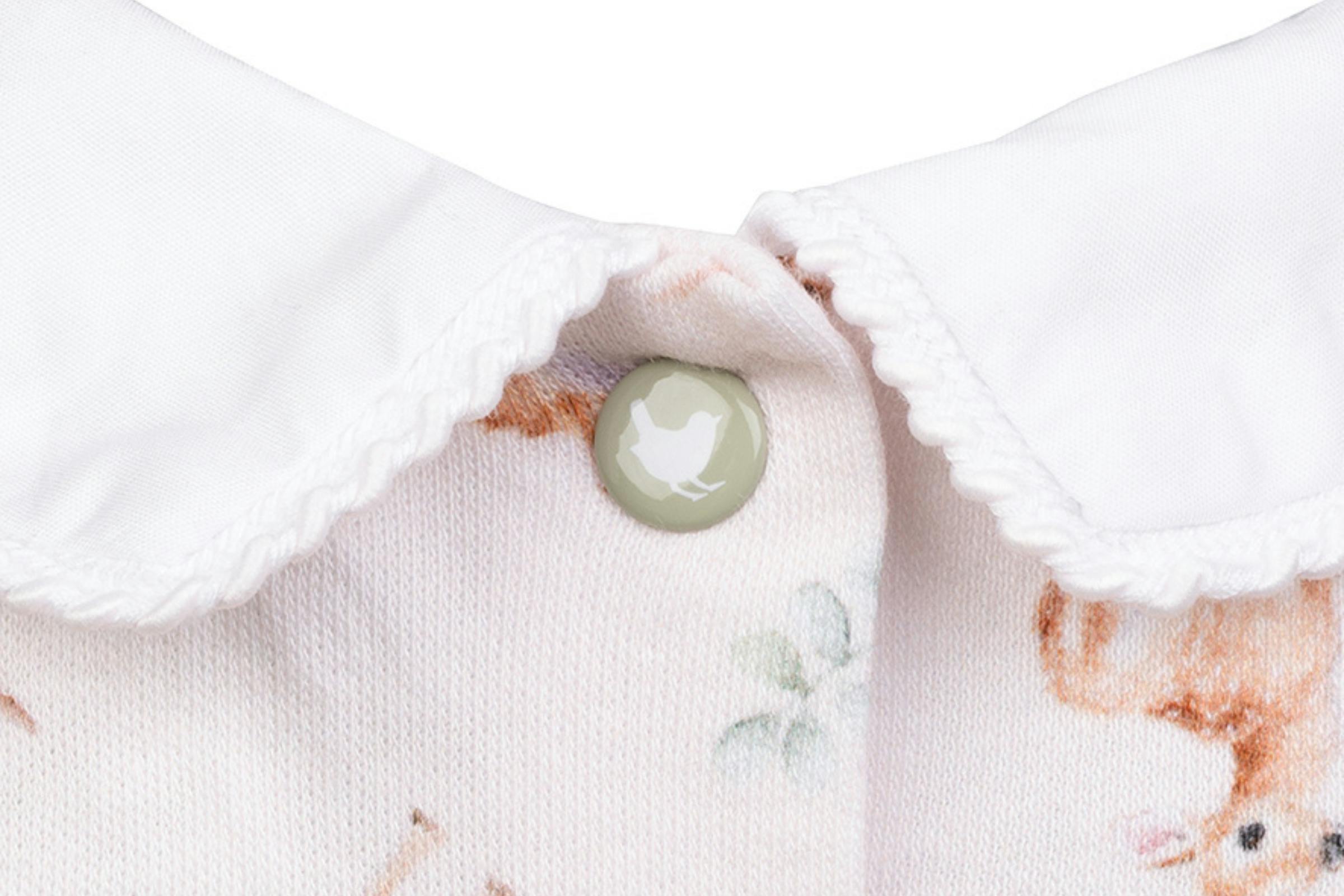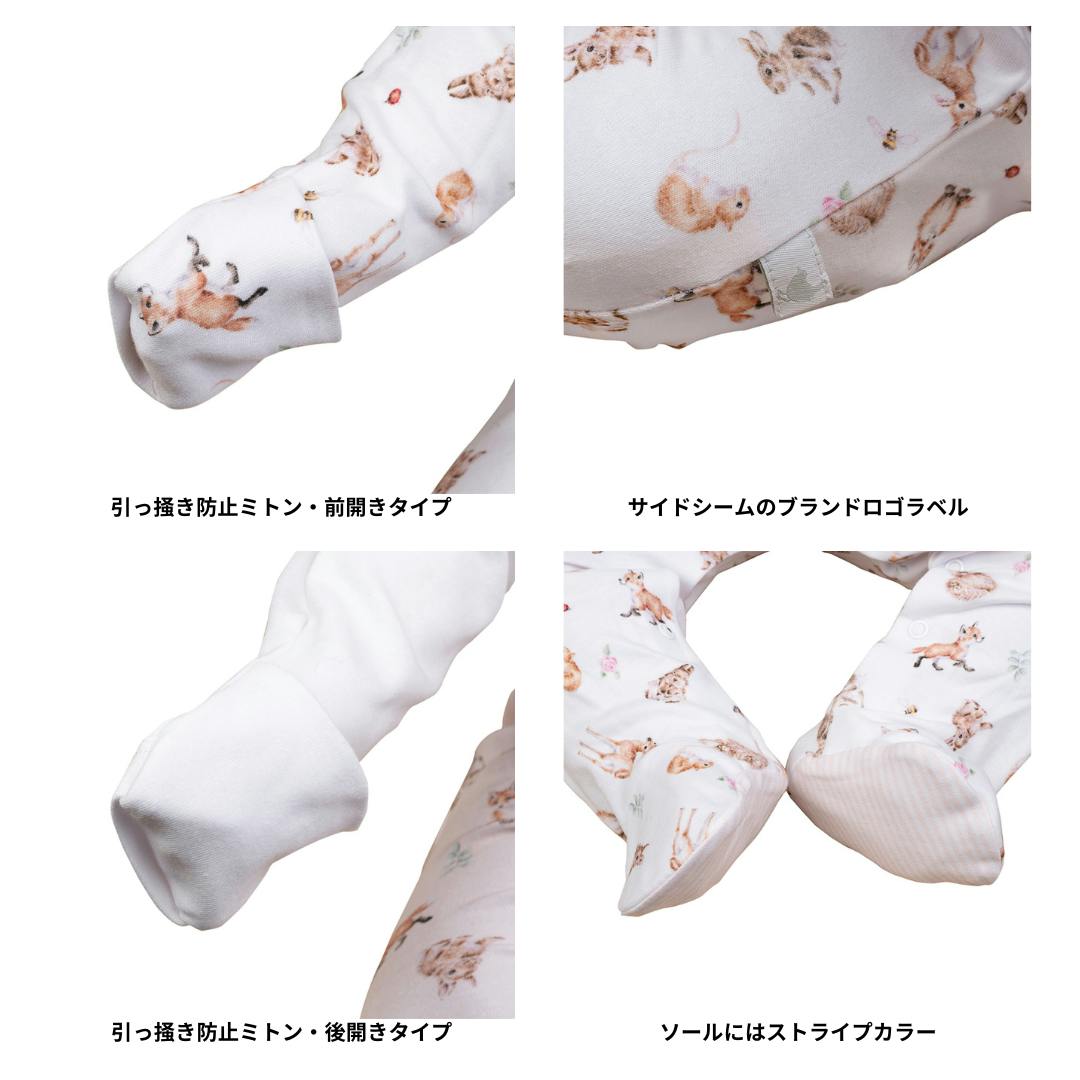 可愛らしい刺繍入りのピーターパンカラーや、ブランドロゴのイラスト入りスナップボタンなど、細部までこだわったデザインですので、赤ちゃんへの特別な贈り物として最適です。