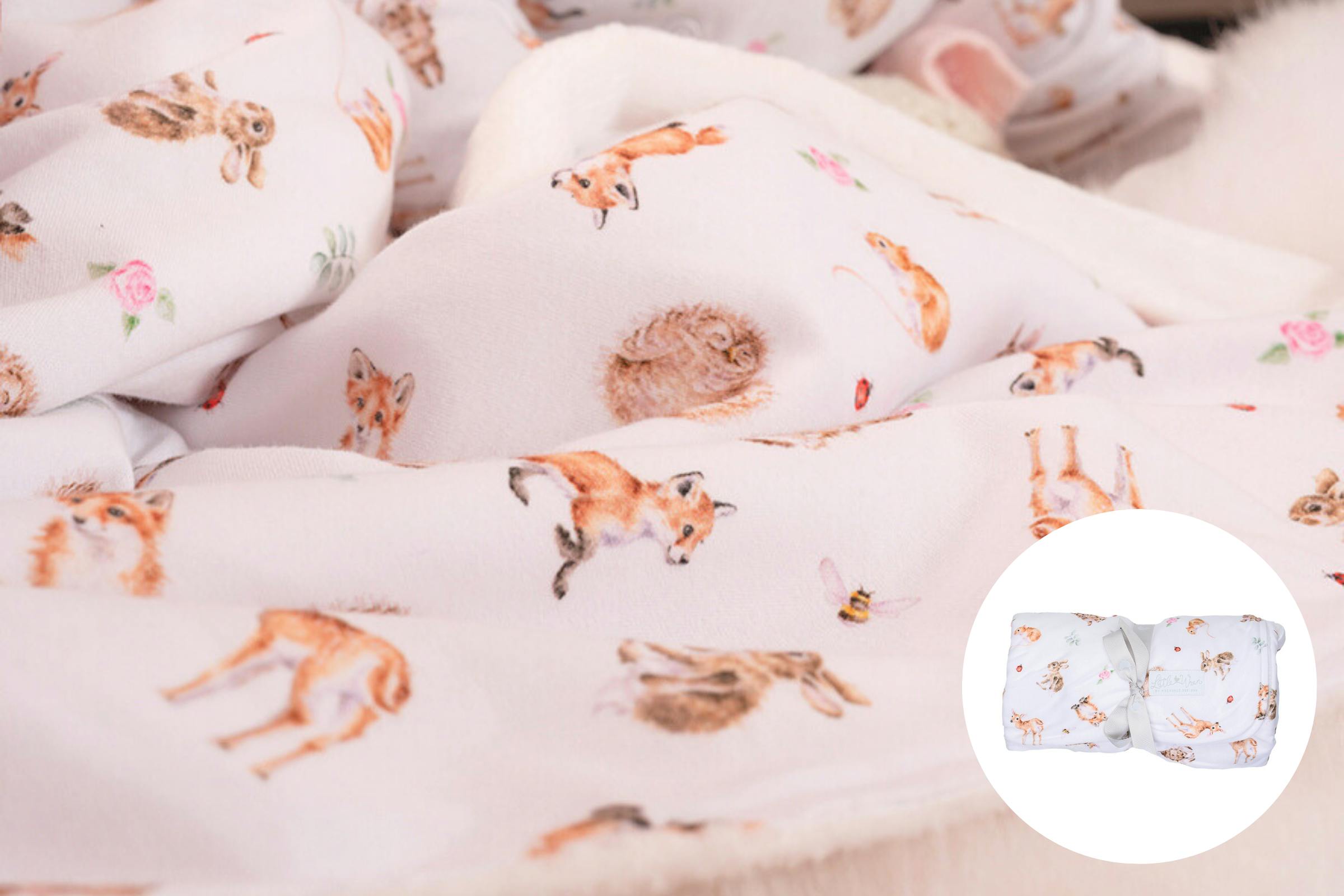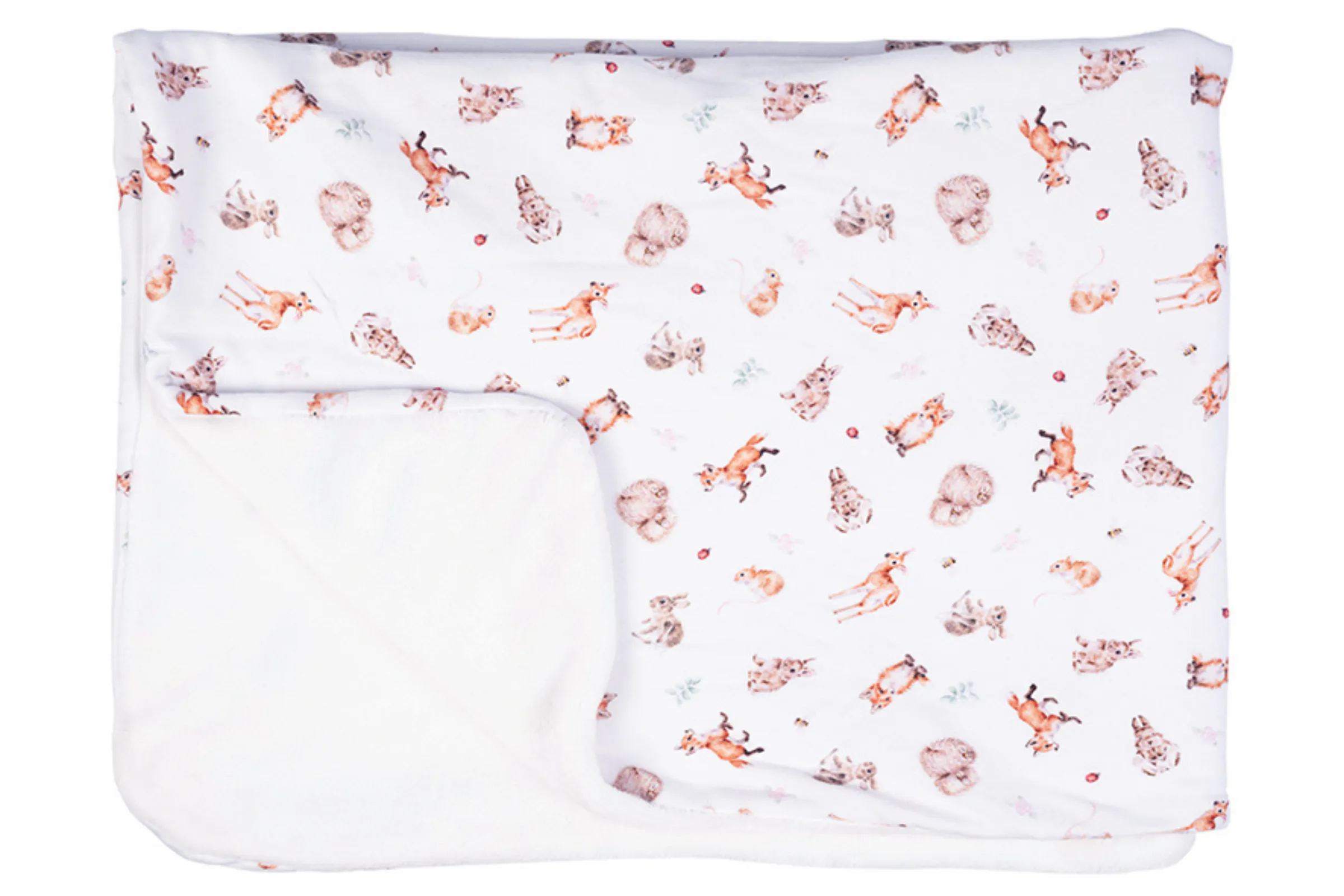 ブランケットの表面は白地の柔らかなコットンに可愛いシカ、キツネ、ウサギ、フクロウ、ネズミの赤ちゃんの総柄がデザインされており、お部屋のアクセントとしても素敵な商品です。
