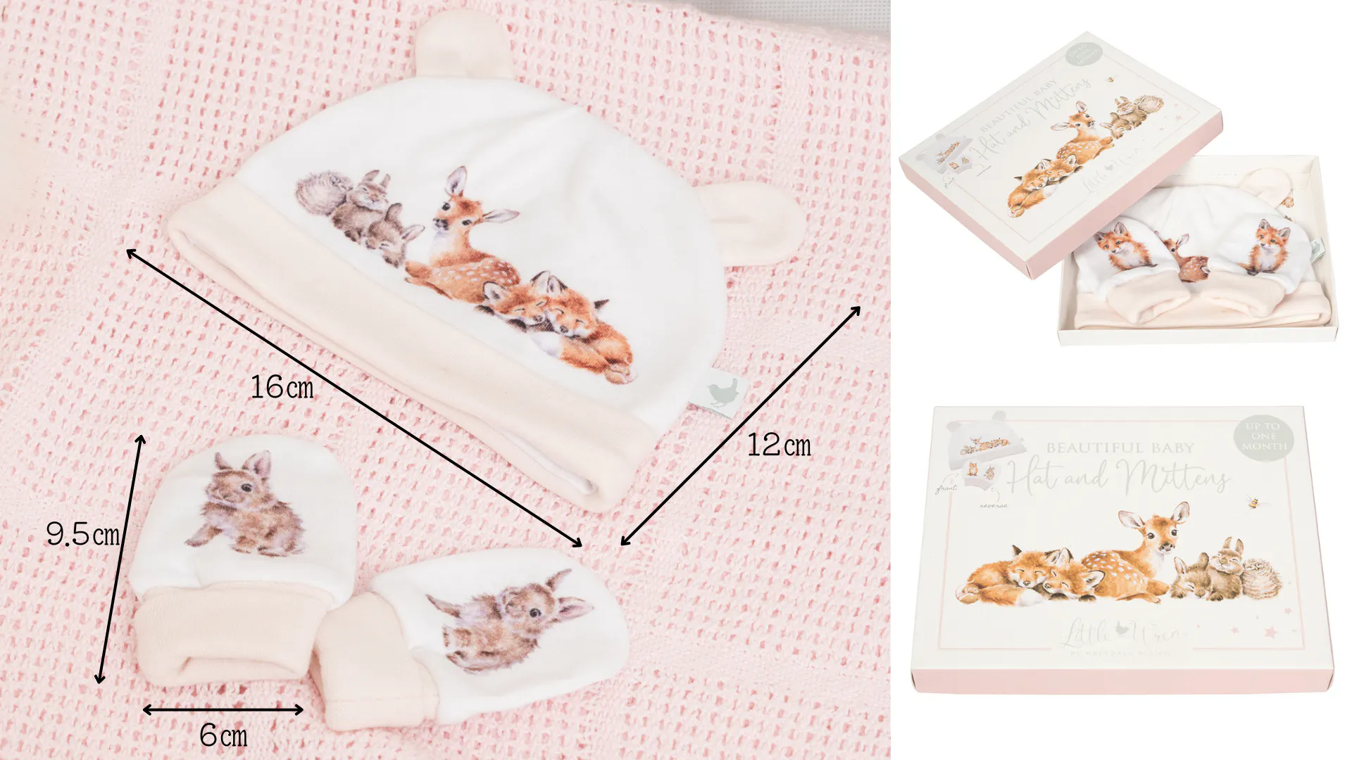 「森の赤ちゃん柄」がデザインされた暖かい帽子と、赤ちゃんの手をやさしく包むミトンのセットです。ロンパースやブランケットとお揃いの柄がとても可愛く、愛らしい耳が特徴の帽子で可愛く着飾ってみませんか?