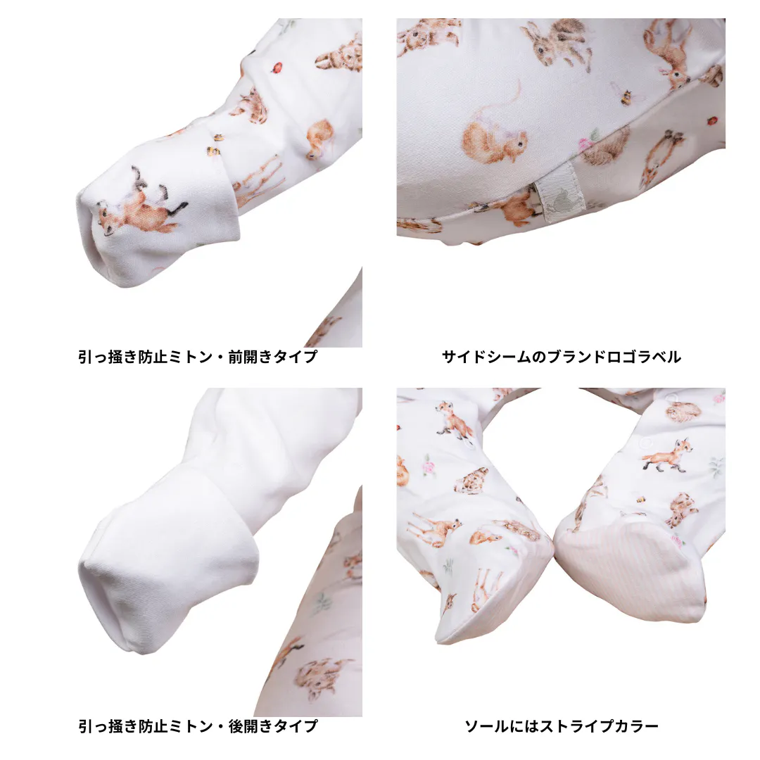 ロンパースに腕に取り付けられたミトンは、赤ちゃんが自分の爪で顔をひっかくのを防ぎ、バンザイ寝の際に手指の防寒もしてくれます。サイドシームには『リトル・レン』のブランドロゴの織りラベル、足の裏にはさりげなくストライプカラーの切り返しパターンなど、レンデールの「細部へのこだわりと品質」で作られています。