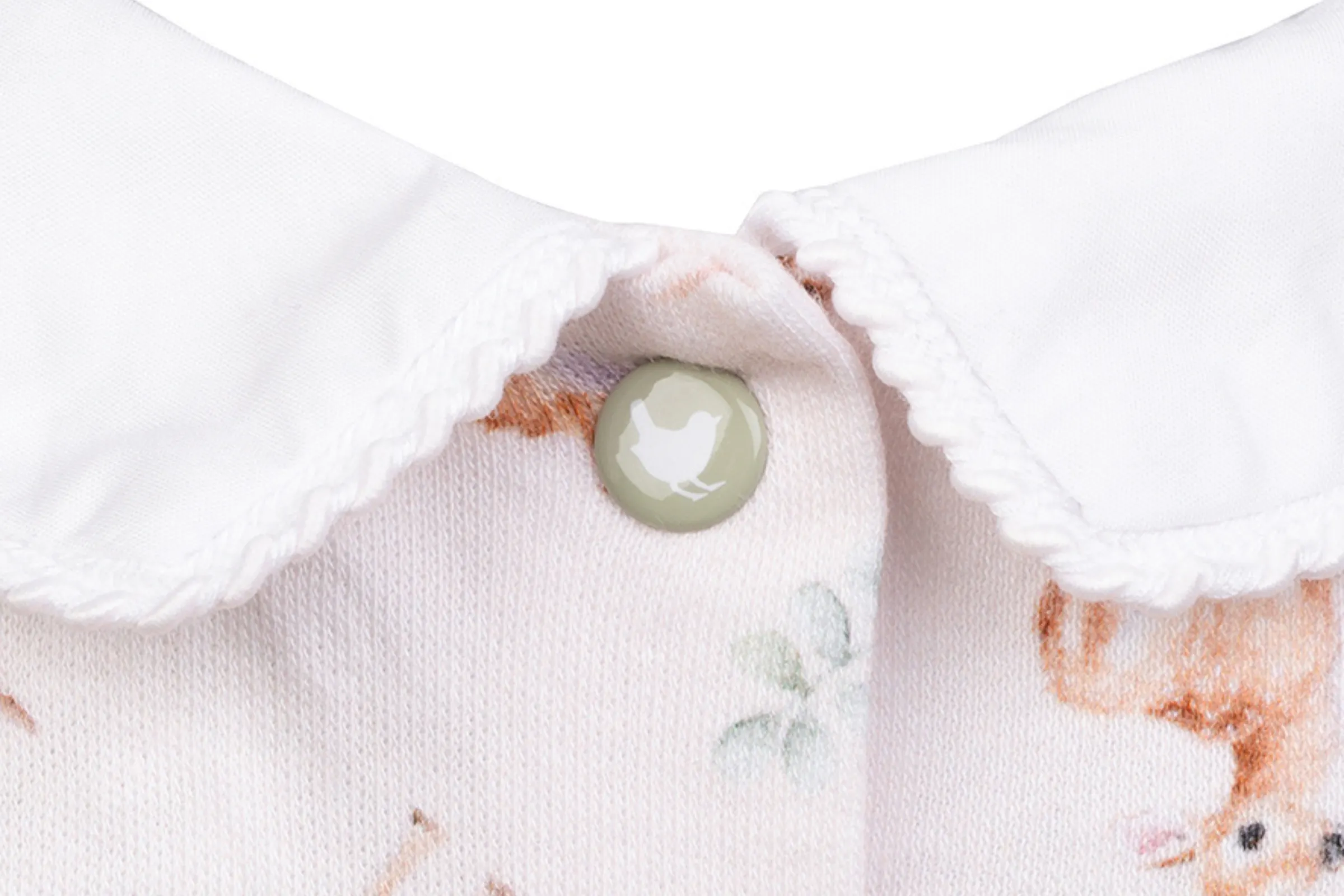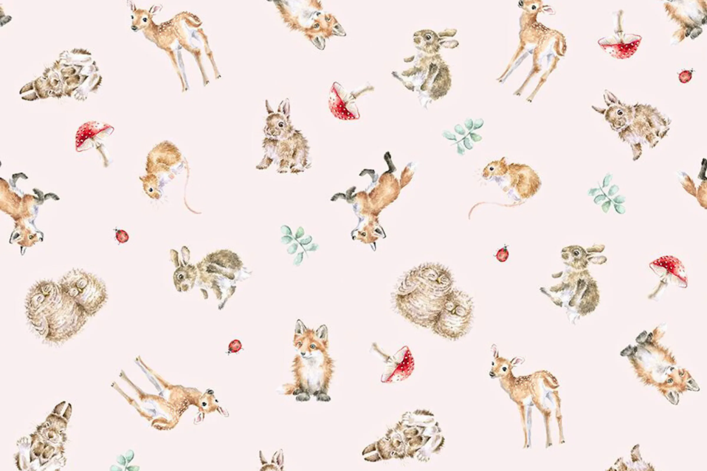 ◆ ソフトなパステルピンク生地に可愛いシカ、キツネ、ウサギ、フクロウ、ネズミの赤ちゃんがデザインされています。