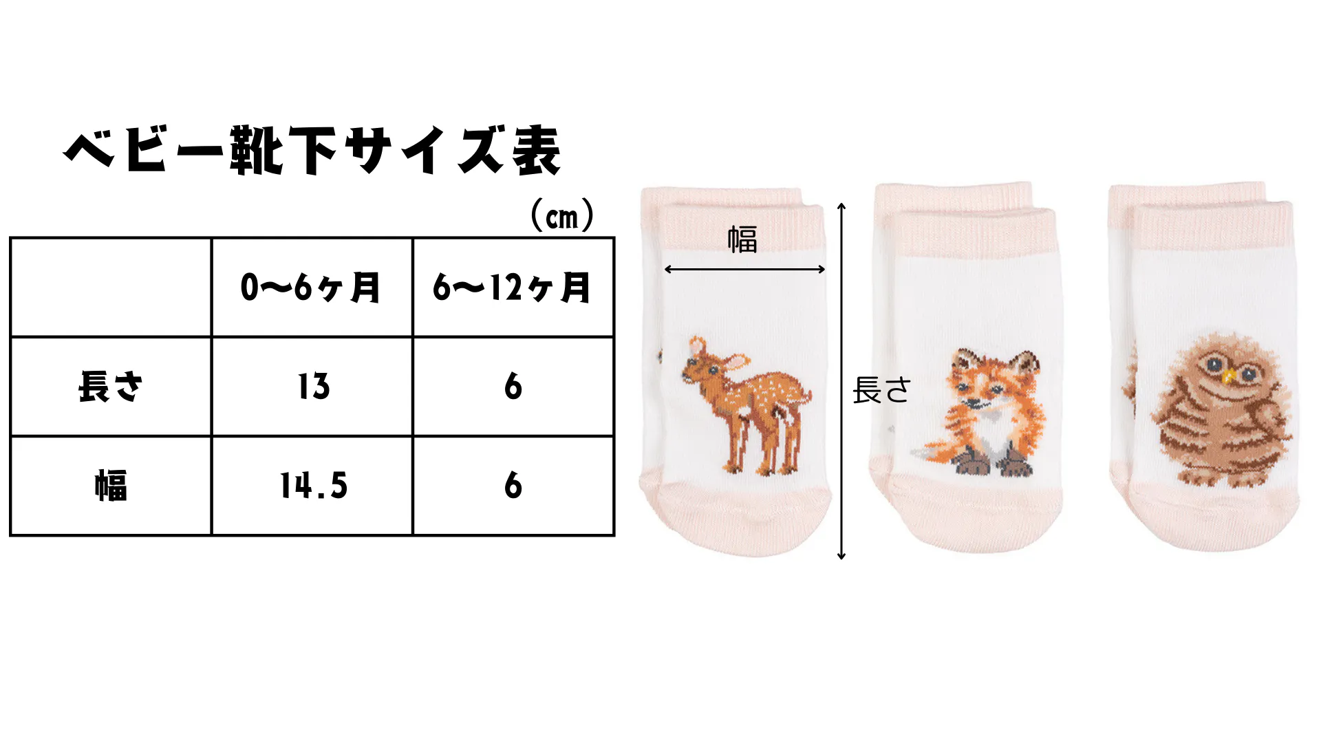 「森の赤ちゃん柄」のシカ・キツネ・フクロウがデザインされたベビー靴下。赤ちゃんの小さな足を優しく包み、快適に保ちます。3足のセットとなっておりますので、毎日の気分に合わせてお選びいただけます。