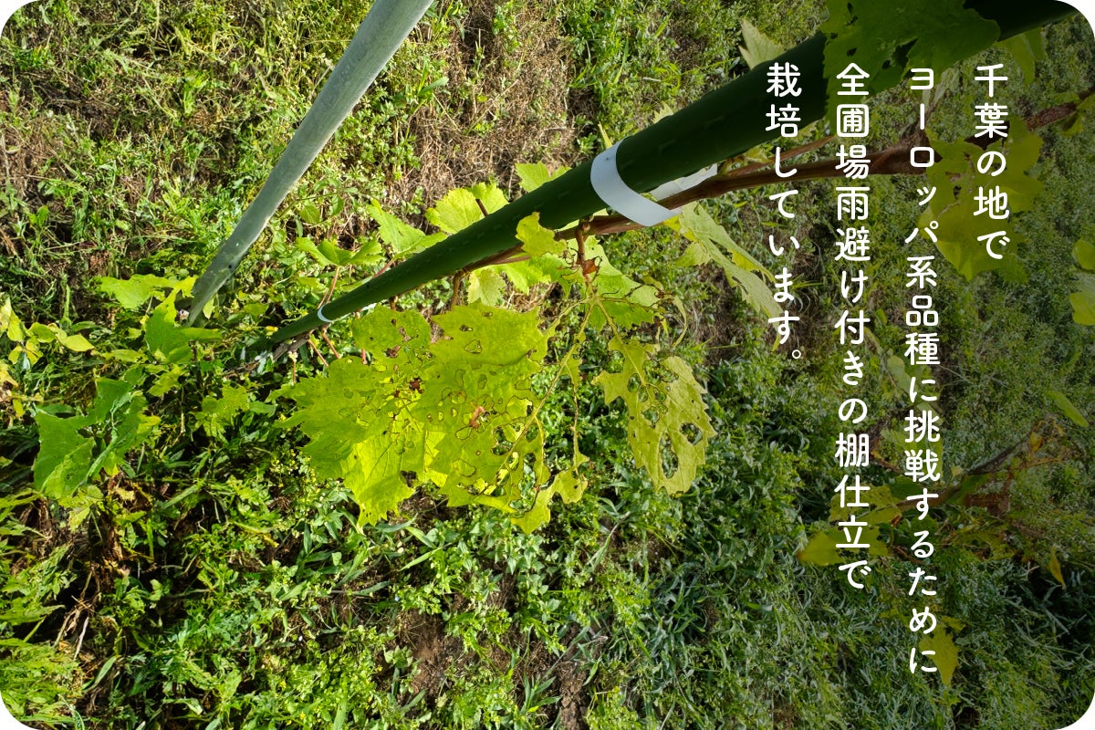 しかし、日本の気候はヨーロッパとは異なり、高温多湿です。ヨーロッパ系品種は、うどんこ病や灰かび病、べと病などの糸状菌類に対して耐性が弱く、ヨーロッパ式の垣根仕立てでは病害のリスクが高まると私たちは考えています。それでも、この千葉の地でヨーロッパ系品種に挑戦するために全圃場雨避け付きの棚仕立で栽培することに決めました。