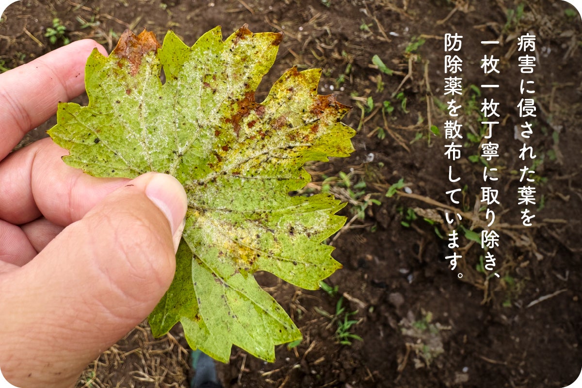 6月頃には、ぶどう園の存続が危ぶまれるほどの危機に直面しましたが、病害に侵された葉を一枚一枚丁寧に取り除き、防除薬を散布するなど、懸命な努力を重ねた結果、なんとか夏場を乗り越え、来年以降の樹の成熟を迎える準備を整えることができました。