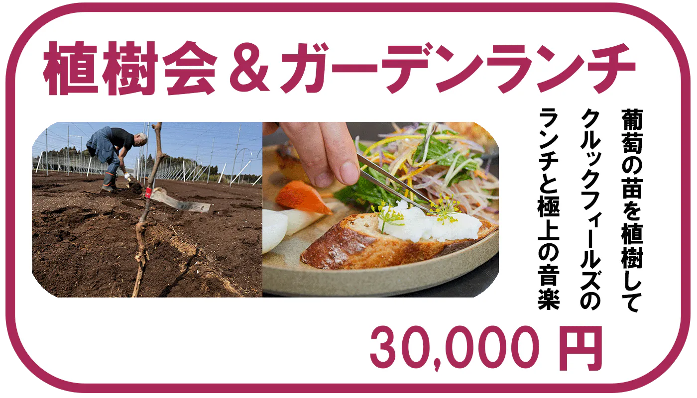 支援者様に一本一本ブドウの樹を植樹していただき、その後畑でささやかな食事会を開催させていただく予定です。当日のガーデンランチは木更津で循環型のくらしを体験できる「KURUKKU FILEDS」が提供。千葉県内の食材などを使い、サステナブルで美味しいランチを楽しみながら、千葉県出身のバイオリニストとギターのデュオ「mille baisers(ミルベゼ)」によるライブもお楽しみいただけます。