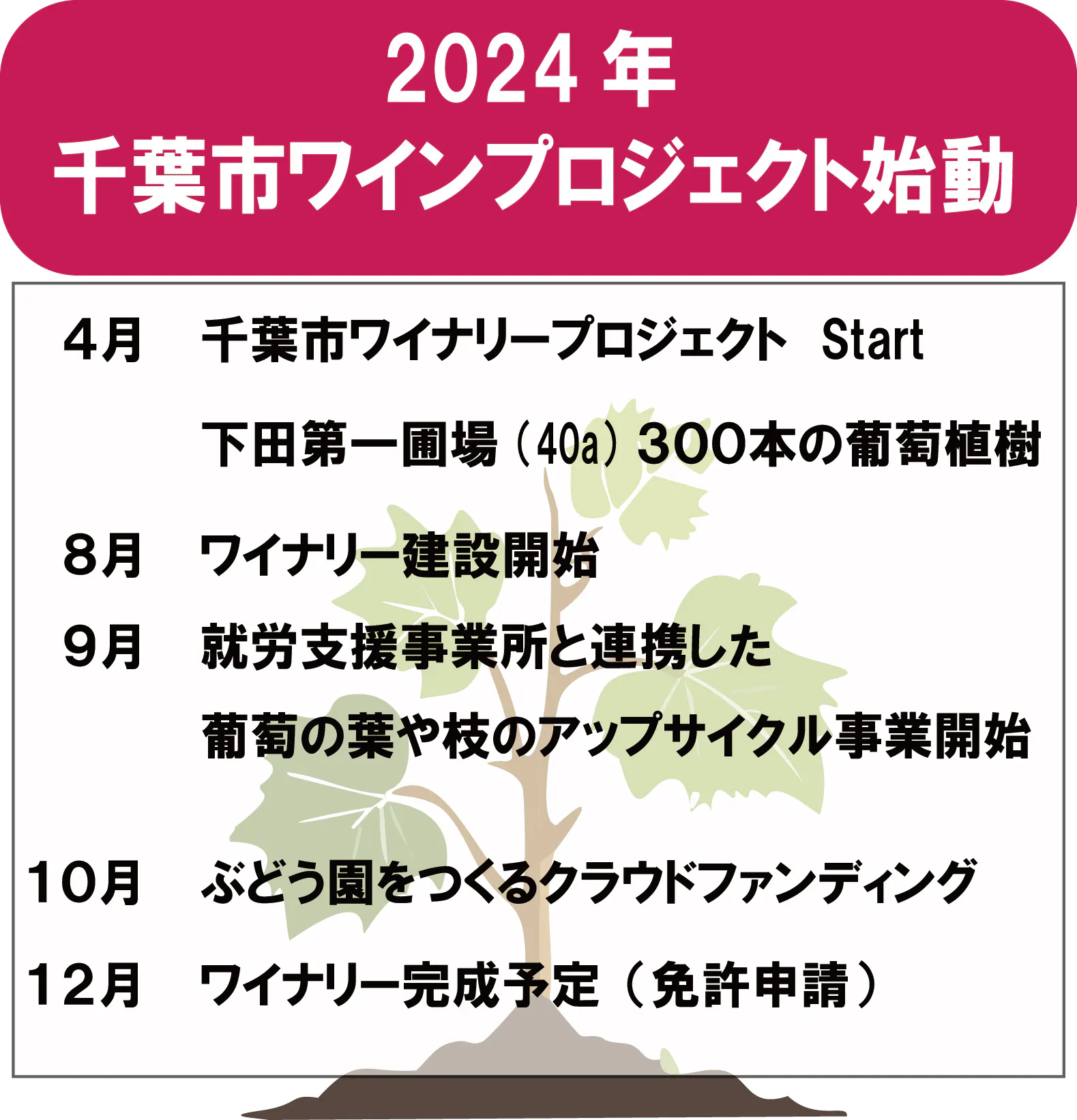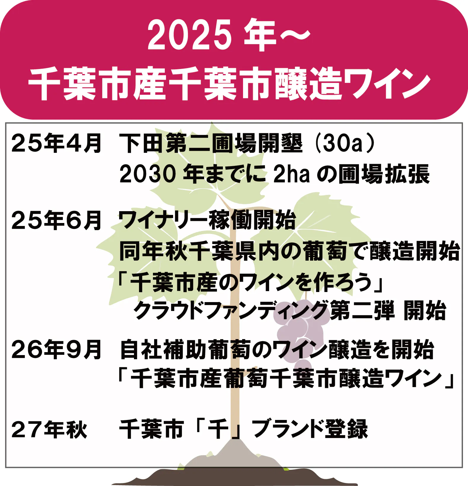 私たちの取り組みは、千葉市を新たなワインの名産地として知らしめる第一歩であり、この地で育まれるワインが、千葉市の誇りとして未来へと語り継がれていくことを願っています。