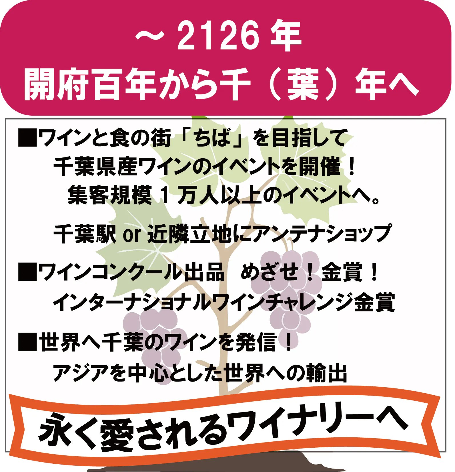 100年後の千葉開府1000年の年には、千(葉)年を祝う千葉を代表するワイナリーへと育っていくことが私たちの夢の一つでもあります。